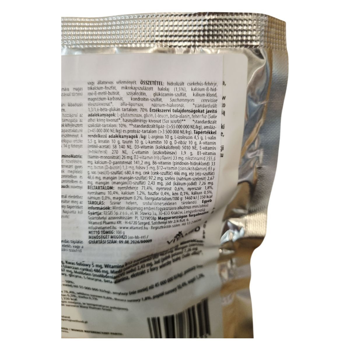 hidrolizált csirkehús-fehérje, trikalcium-foszfát, mikrokapszulázott halolaj (1,5%), kalcium-ß-hidroxi-ß-metil-butirát, szójaleicin, glükozamin-szulfát, kálium-klorid, magnézium-karbonát, kondroitin-szulfát, Saccharomyces cerevisiae élesztőkivonat, alfa-lipoinsav, nátrium-hialuronát, L-glutamin, glicin, L-leucin, beta-alanin, fehér fűz (Salix alba) kéreg kivonat, hasnyálmirigy-kivonat (Sus scrofa)