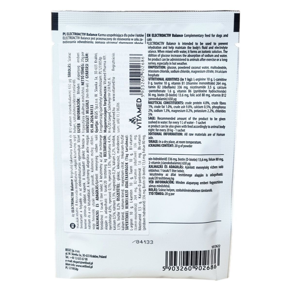 A folyadék- és elektrolit-háztartás egyensúlyának fenntartására szolgáló készítmény kutyáknak és macskáknak. Vízben oldva izotóniás oldatot képez.