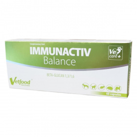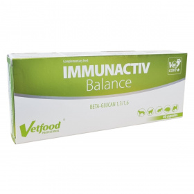 Az IMMUNACTIV Balance kiegészítő takarmány kutyák, macskák, vadászgörények, rágcsálók és madarak részére készült, természetes béta-1,3/1,6-glükánt tartalmaz, amely a sütőélesztő sejtfalából származik. Ez a poliszacharid az immunrendszer nem specifikus első védelmi vonalaként működhet, elősegítve a megfelelő immunválaszt. A készítmény különösen ajánlott immunrendszer gyengülése, daganatos megbetegedések, lábadozás, valamint antibiotikum kezelés alatt és azt követően. Az adagolás az állat súlyától függően történik, és a kapszula szükség esetén felnyitható, tartalmát az eledelbe lehet keverni. Az összetevők emberi fogyasztásra alkalmas minőségű alapanyagokból készülnek. A csomagolás 60 kapszulát tartalmaz, egy kapszula tömege 560-620 mg körül mozog.
