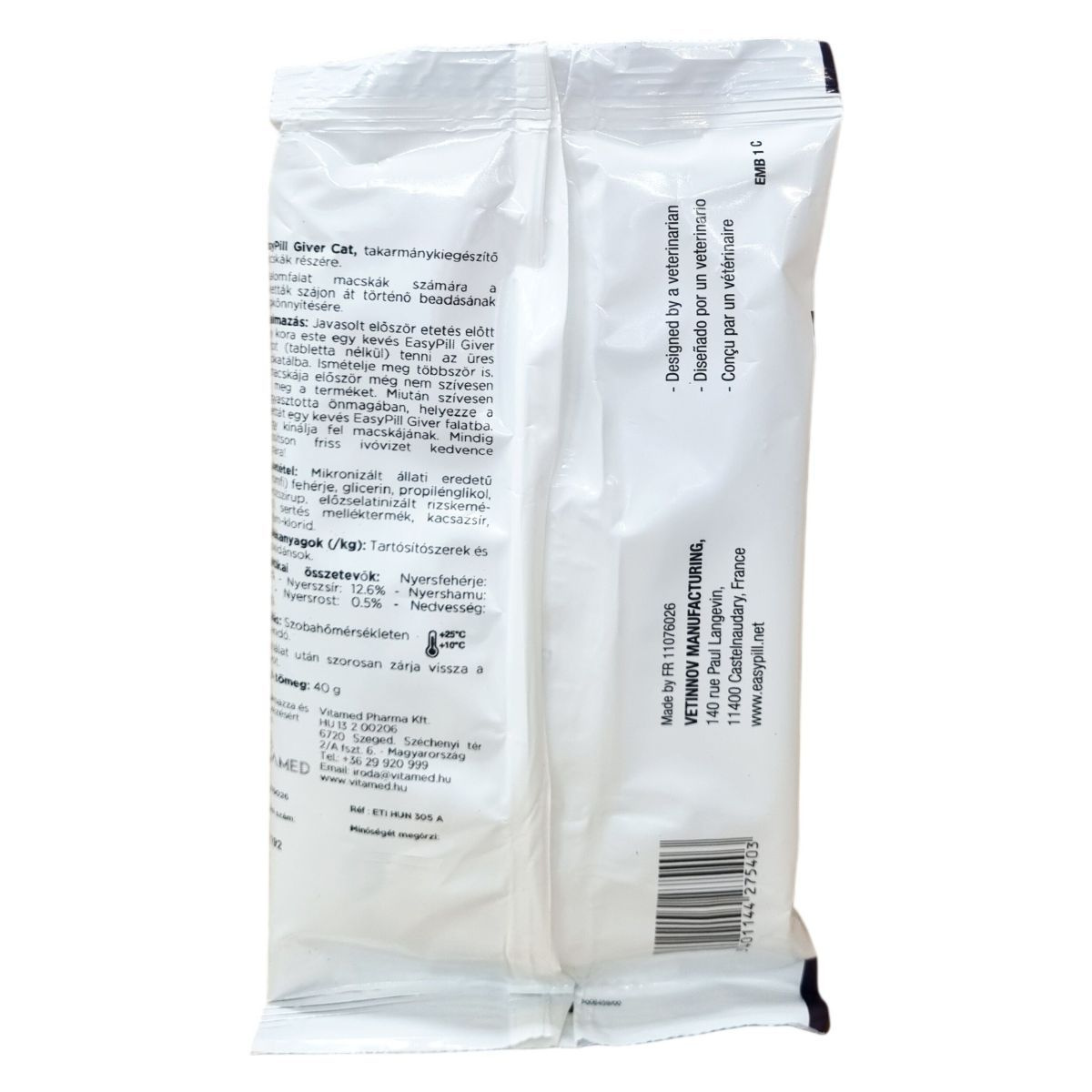 Javasolt először etetés előtt egy kevés EasyPill Giver falatot (tabletta nélkül) adni a macskának. Miután szívesen elfogyasztotta, helyezze a tablettát egy falatba, és így kínálja kedvencének. Mindig biztosítson friss ivóvizet az állat számára!