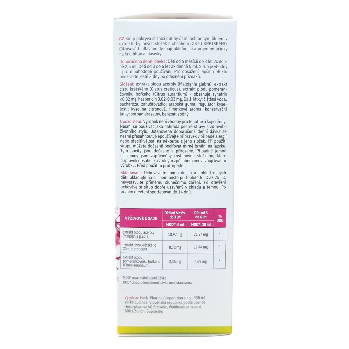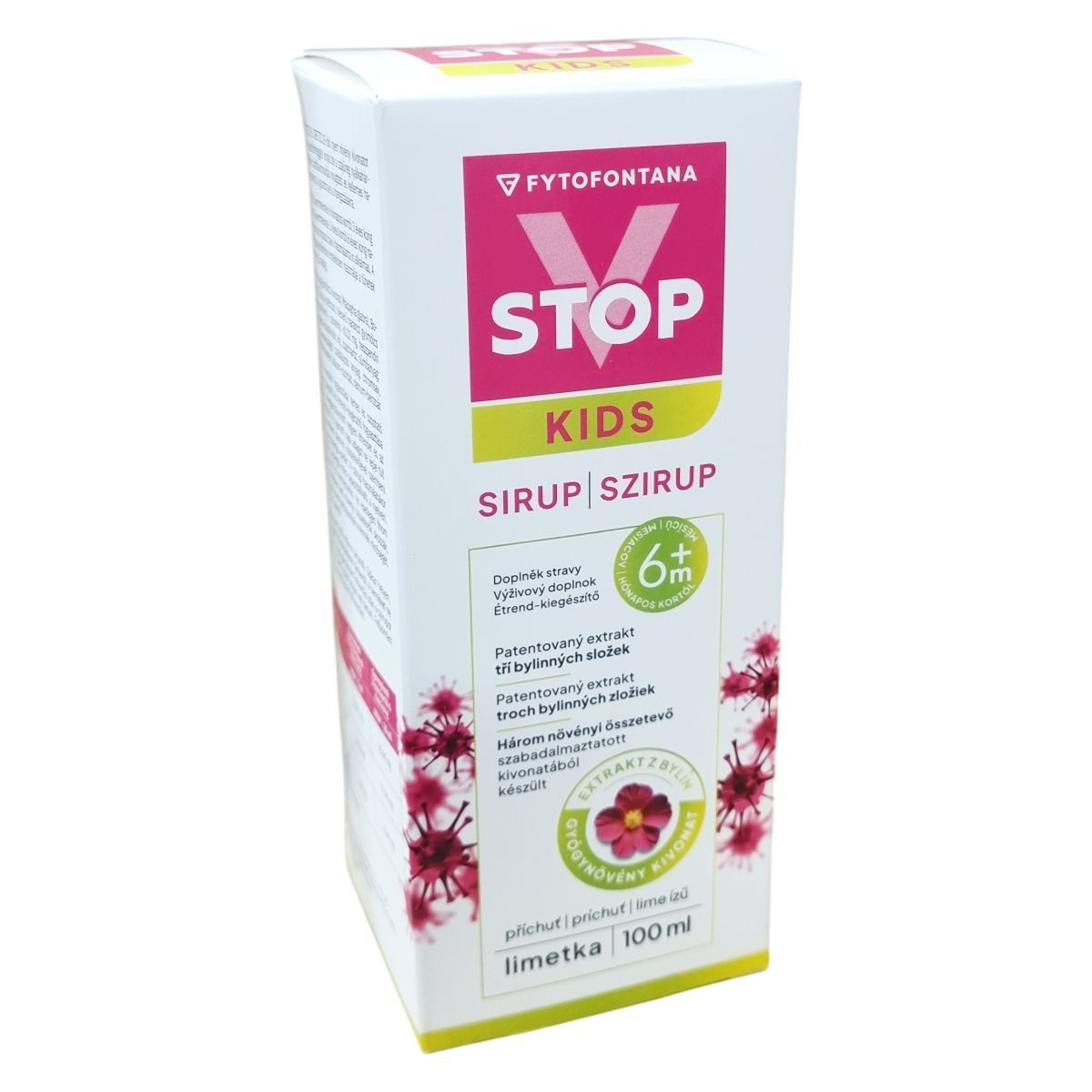 A Fytofontana V Stop Kids szirup három növényi kivonatból, acerola, bodorrózsa (Cistus creticus) és keserű narancs gyümölcs kivonatából áll. A Cistus creticus kivonat védőréteget képezhet a szájüreg nyálkahártyáján, míg a citrusfélék bioflavonoidjai kellemes, nyugtató hatással lehetnek a torok, garat és hangszálak területén. A készítmény lime ízű, tisztított vizet, szacharózt, gumiarabikumot, citromsavat, lime aromát valamint tartósítószereket is tartalmaz, amelyek segíthetik az állag és eltarthatóság megőrzését. A szirup fokozott elővigyázatossággal alkalmazandó terhes és szoptató nők, illetve azok számára, akik allergiásak vagy túlérzékenyek bármely összetevőjére. Használat közben átmeneti enyhe bizsergő érzés előfordulhat, amely természetes. A növényi összetevők miatt előfordulhatnak finom üledékek, melyek nem befolyásolják a termék minőségét. Az adagolás a gyermekek korcsoportja szerint történik, napi 2 vagy 4 adagban, és a kezelést tüneti javulás után célszerű még három napig folytatni a jobb hatékonyság érdekében.