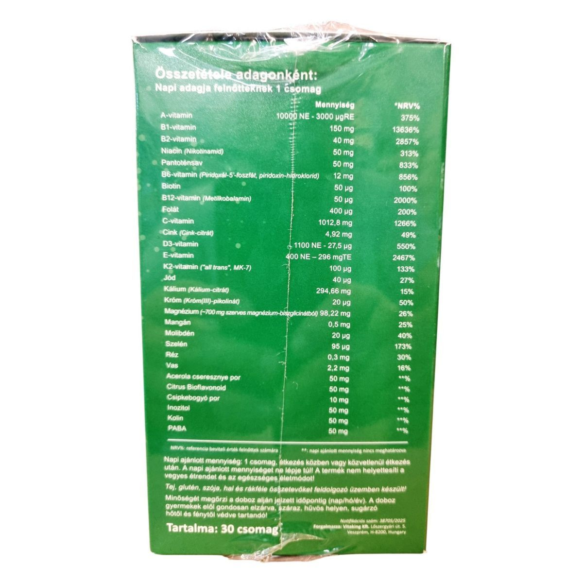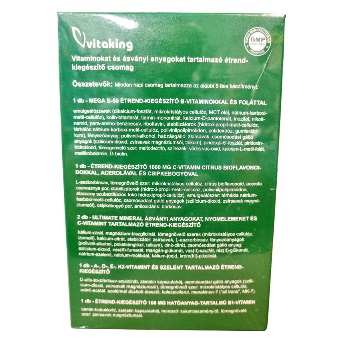 A Vitaking 365 Multivitamin egy komplex étrend-kiegészítő, amely vitaminokat és ásványi anyagokat tartalmaz az év minden napjára. A termék napi egy csomagja hozzájárulhat az immunrendszer és az idegrendszer normál működéséhez, valamint a fáradtság csökkentéséhez. A csomag tartalmazza az A-, B-, C-, D-, E- és K2-vitaminokat, valamint ásványi anyagokat, mint a cink, vas, réz és szelén. A termék tej, glutén, szója, hal és rákfélék összetevőit feldolgozó üzemben készült, ezért allergiásoknak érdemes figyelniük erre. A termék nem helyettesíti a vegyes étrendet és az egészséges életmódot, és gyermekek elől elzárva, száraz, hűvös helyen tárolandó.