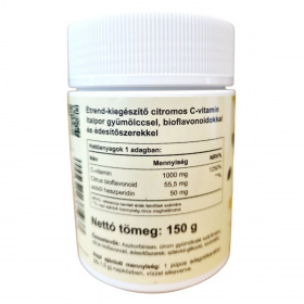 Étrend-kiegészítő citromos C-vitamin italpor gyümölccsel, bioflavonoidokkal és édesítőszerekkel. A C-vitamin hozzájárul az immunrendszer normál működéséhez. Hozzájárul az idegrendszer normál működéséhez és a normál pszichológiai funkció fenntartásához. A C-vitamin továbbá hozzájárul a fáradtság és a kifáradás csökkentéséhez.