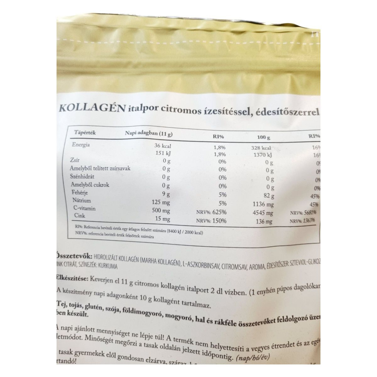 Hidrolizált kollagén (marha kollagén), L-aszkorbinsav, citromsav, aroma, édesítőszer: szteviol-glikozid, cink citrát, színezék: kurkuma
