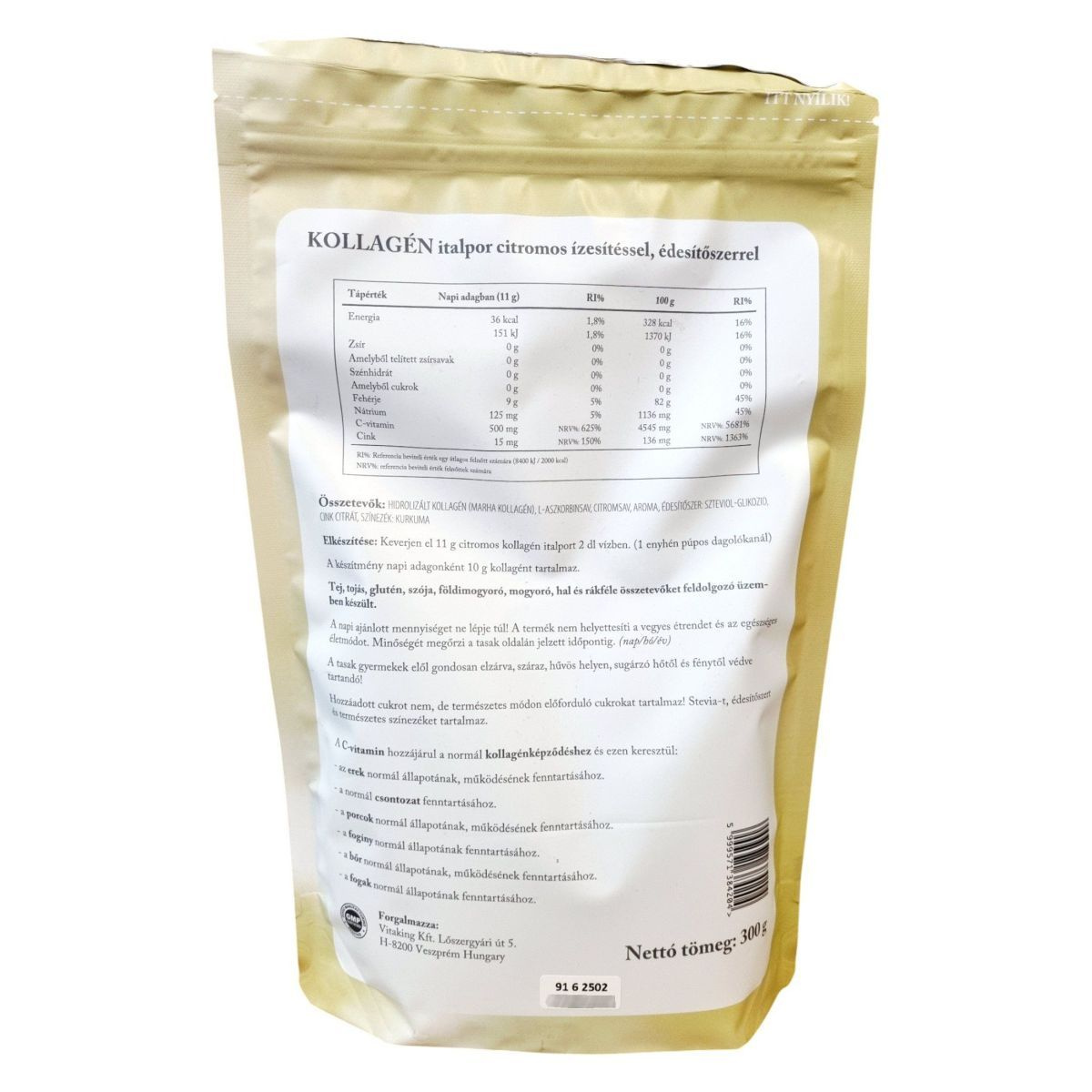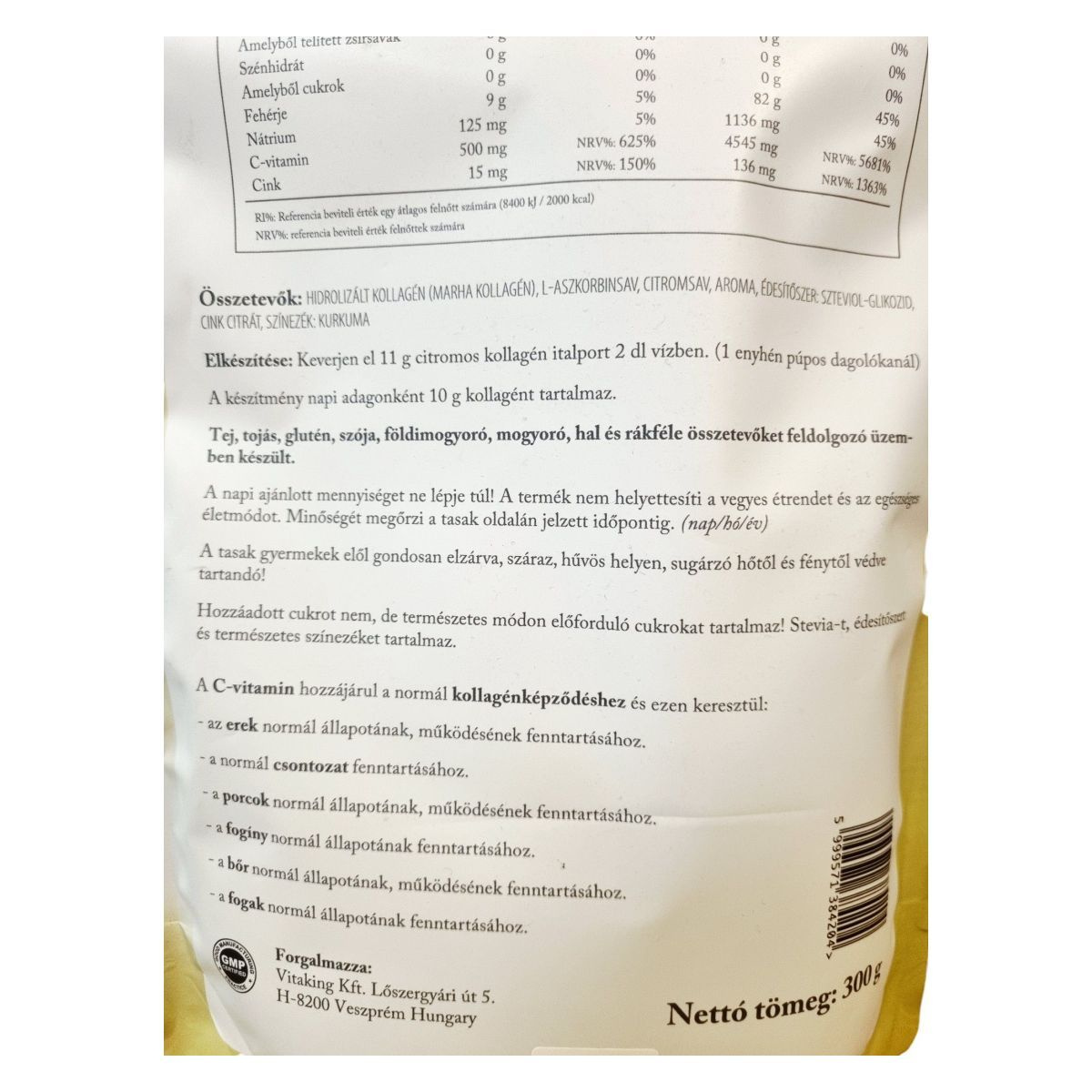 A Vitaking KOLLAGÉN citrom ízű italpor egy speciális étrend-kiegészítő, amely hidrolizált kollagén peptideket tartalmaz. A termék steviával édesített, hozzáadott cukrot nem tartalmaz, és természetes színezéket tartalmaz. A C-vitamin tartalma hozzájárulhat a normál kollagénképződéshez, amely támogathatja az erek, a csontok, a porcok, a fogíny, a bőr és a fogak normál állapotának fenntartását. A termék tej, tojás, glutén, szója, földimogyoró, mogyoró, hal és rákféle összetevőket feldolgozó üzemben készült.
