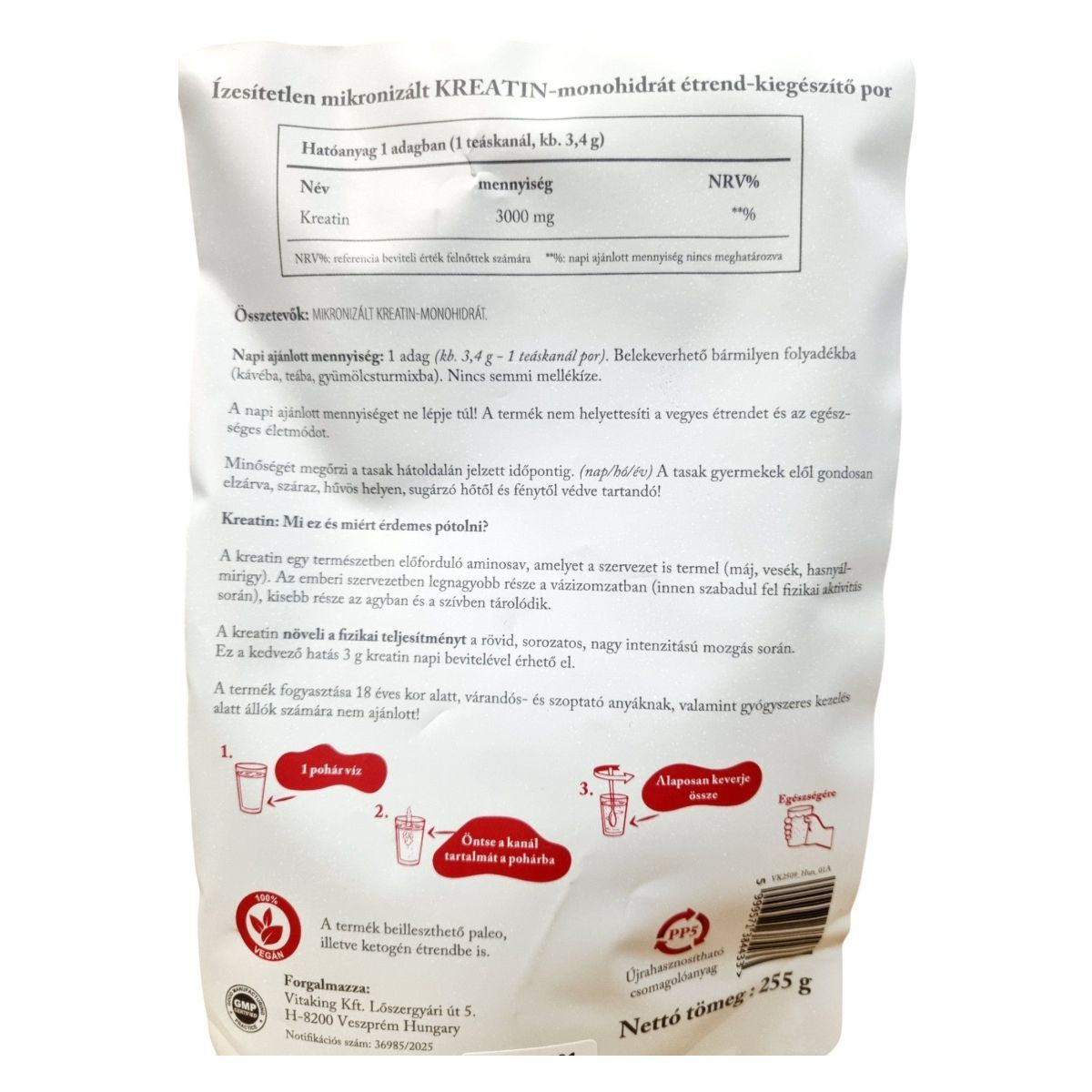 A kreatin egy természetes aminosav, amely megtalálható a szervezetben, főként a májban, vesékben és hasnyálmirigyben termelődik. Szerepe, hogy segíthet az energiatermelésben, különösen a rövid, intenzív fizikai aktivitás során. A szervezet kreatinraktárai a vázizomban találhatók, innen szabadul fel az energiaigényes folyamatokhoz. A rendszeres kreatinfogyasztás hozzájárulhat a fizikai teljesítmény fokozásához rövid, sorozatos, nagy intenzitású mozgás esetén. A mikronizált forma gyorsan oldódik és jól keverhető, így könnyen beilleszthető mindennapi étrendbe. A termék 100%-ban tiszta, vegán összetételű és mentes minden mesterséges adaléktól.