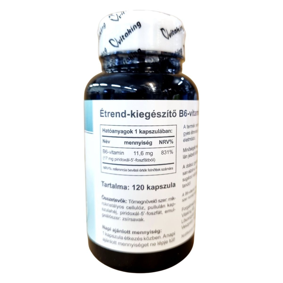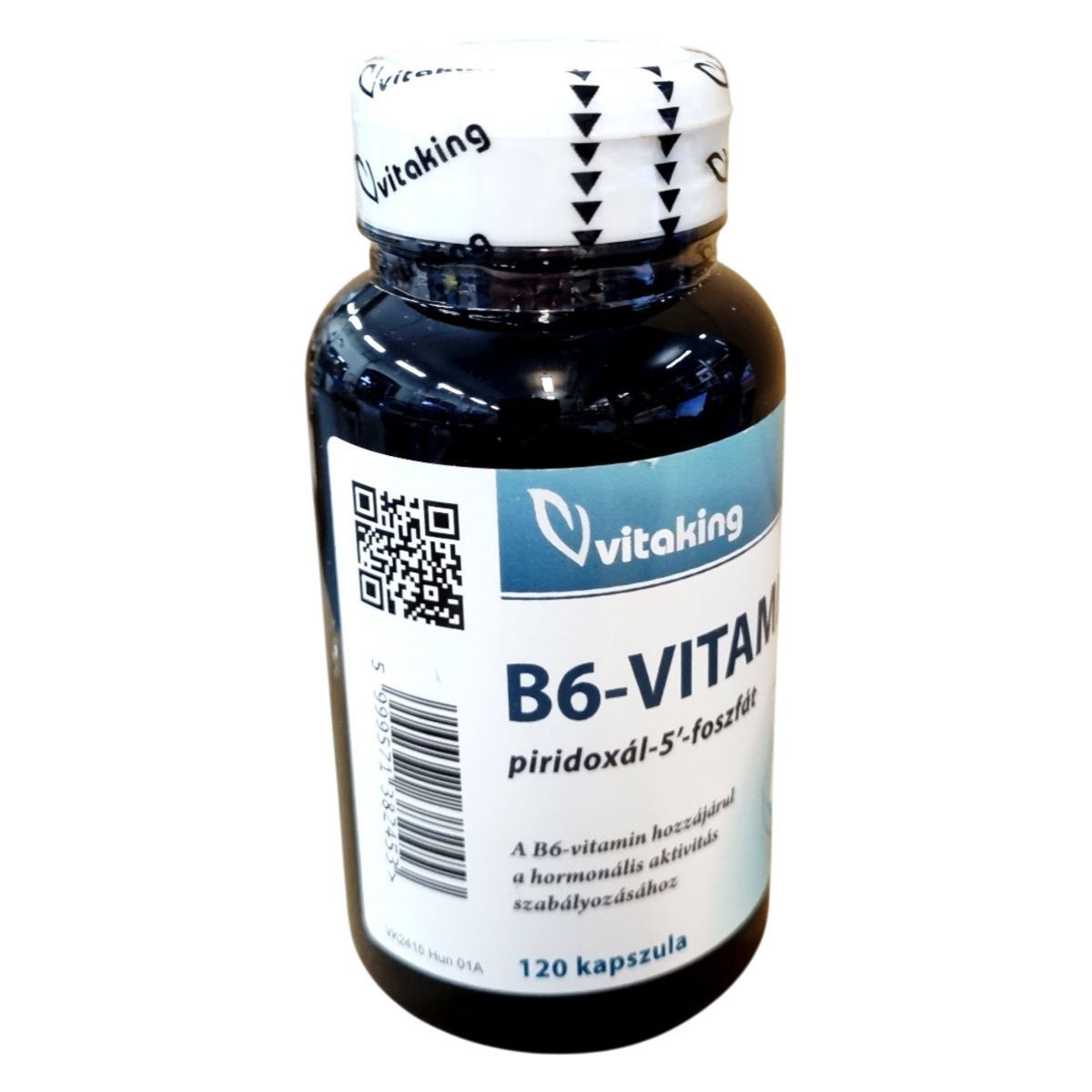 A Vitaking B6-VITAMIN étrend-kiegészítő 120 kapszulás kiszerelésben kapható. A termék fő hatóanyaga a B6-vitamin, amely piridoxál-5'-foszfát formájában van jelen. A B6-vitamin hozzájárulhat a hormonális aktivitás szabályozásához és az idegrendszer normál működéséhez. A termék nem helyettesíti a vegyes étrendet és az egészséges életmódot. Tárolása száraz, hűvös helyen javasolt, gyermekek elől elzárva. A termék forgalmazója a Vitaking Kft., és a notifikációs száma 36172/2024.