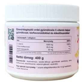 Ez az étrend-kiegészítő italpor C-vitamint, citrus bioflavonoidokat, valamint természetes erdei gyümölcsös ízt tartalmaz. A termék az aszkorbinsav mellett szeder-áfonya gyümölcslé szárítmányt és természetes édesítőszereket, például szteviol-glikozidot és szukralózt tartalmaz. A C-vitamin fontos szerepet játszhat az immunrendszer, az idegrendszer és a pszichológiai funkciók támogatásában, továbbá segítheti a fáradtság és kifáradás csökkentését. A termék adagolása egyszerű, a javasolt napi adagolókanálnyi por vízzel elkeverve fogyasztandó. A csomagot gyermekektől elzárva, száraz, hűvös és fénytől védett helyen ajánlott tárolni.