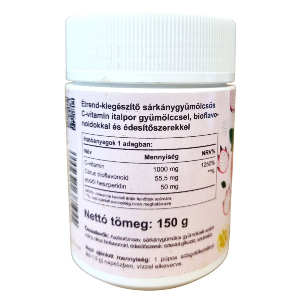 Étrend-kiegészítő sárkánygyümölcsös C-vitamin italpor gyümölccsel, bioflavonoidokkal és édesítőszerekkel. A C-vitamin hozzájárul az immunrendszer normál működéséhez. Hozzájárul az idegrendszer normál működéséhez és a normál pszichológiai funkció fenntartásához. A C-vitamin továbbá hozzájárul a fáradtság és a kifáradás csökkentéséhez.