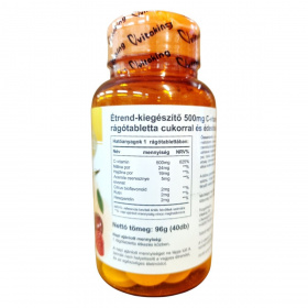Az Acerola C-500 rágótabletta 500 mg C-vitamint tartalmaz, amely hozzájárulhat az immunrendszer normál működéséhez. Málna ízesítéssel készült, és tartalmaz acerola cseresznye kivonatot, citrus bioflavonoidokat, rutint és heszperidint is.