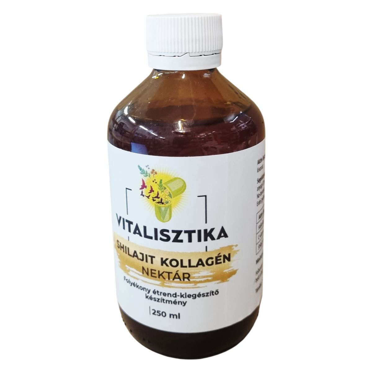 A Vitalisztika Shilajit Kollagén Nektár egy 250 ml-es folyékony étrend-kiegészítő készítmény, amely halkollagént, L-aszkorbinsavat (C-vitamin) és shilajit kivonatot tartalmaz. Az aktív összetevők mellett tisztított víz, szukróz mint édesítőanyag, citromsav a savanyúság szabályozására, valamint nátrium-benzoát és kálium-szorbát tartósítószerként kapott helyet. Az erdei gyümölcs aroma természetes ízvilágot kölcsönöz a terméknek. A készítmény szobahőmérséklettől hűvösebb, 2 és 15 °C közötti tárolást igényel, valamint védelmet a napfénytől és a sugárzó hőtől. Felbontás után ajánlott hűtőszekrényben tárolni, és egy hónapon belül elfogyasztani. A termék származási helye Magyarország, és a Thermészet Varázs Kft. forgalmazza.
