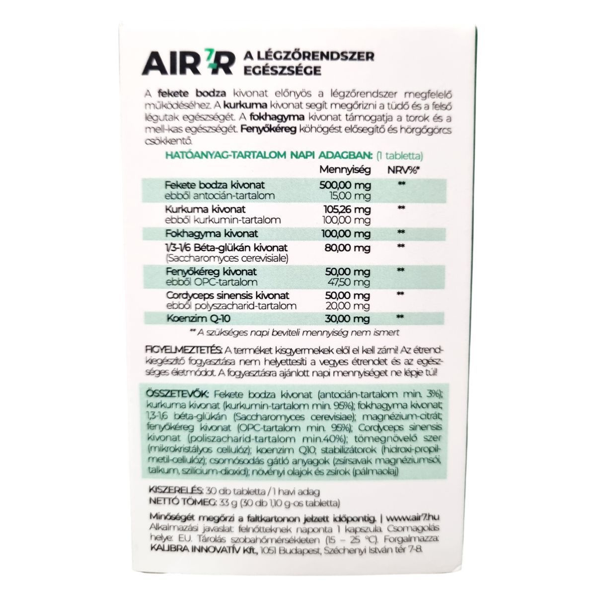 Az AIR7-R a légzőrendszer egészségét támogató étrend-kiegészítője, mely fekete bodza, kurkuma, fokhagyma és fenyőkéreg kivonatot tartalmaz, amelyek segítenek megőrizni a légzőrendszer egészségét.