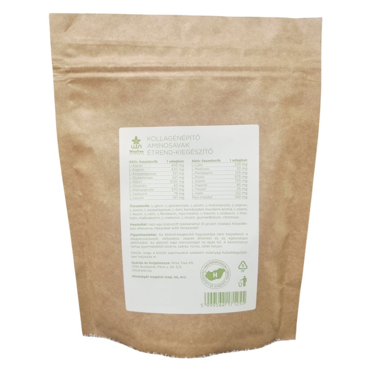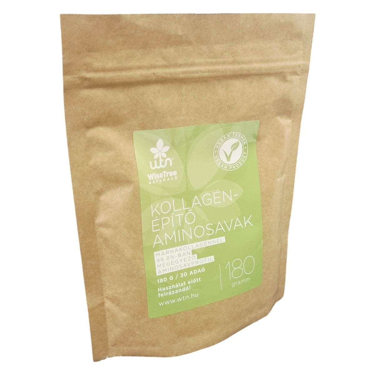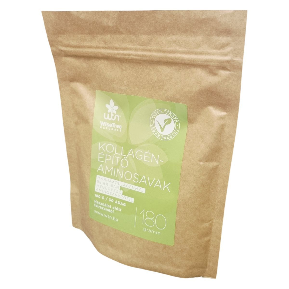 A WiseTree Naturals Kollagénépítő aminosavak étrend-kiegészítő olyan aminosavakat tartalmaz, amelyek 98,8%-ban megegyeznek a marhakollagén aminosavprofiljával. A termék praktikus, 180 grammos kiszerelésben, 30 adagban érhető el. Használat előtt minden esetben fel kell rázni, és napi egy púpozott teáskanálnyi adagot vízalapú folyadékban javasolt elkeverni. A termék összetevői között megtalálhatók a legfontosabb kollagénépítő aminosavak, valamint természetes mandarin aroma és inozitol. Környezettudatosság jegyében a kiürült papírtasak a szelektív műanyag hulladékgyűjtőben helyezhető el.