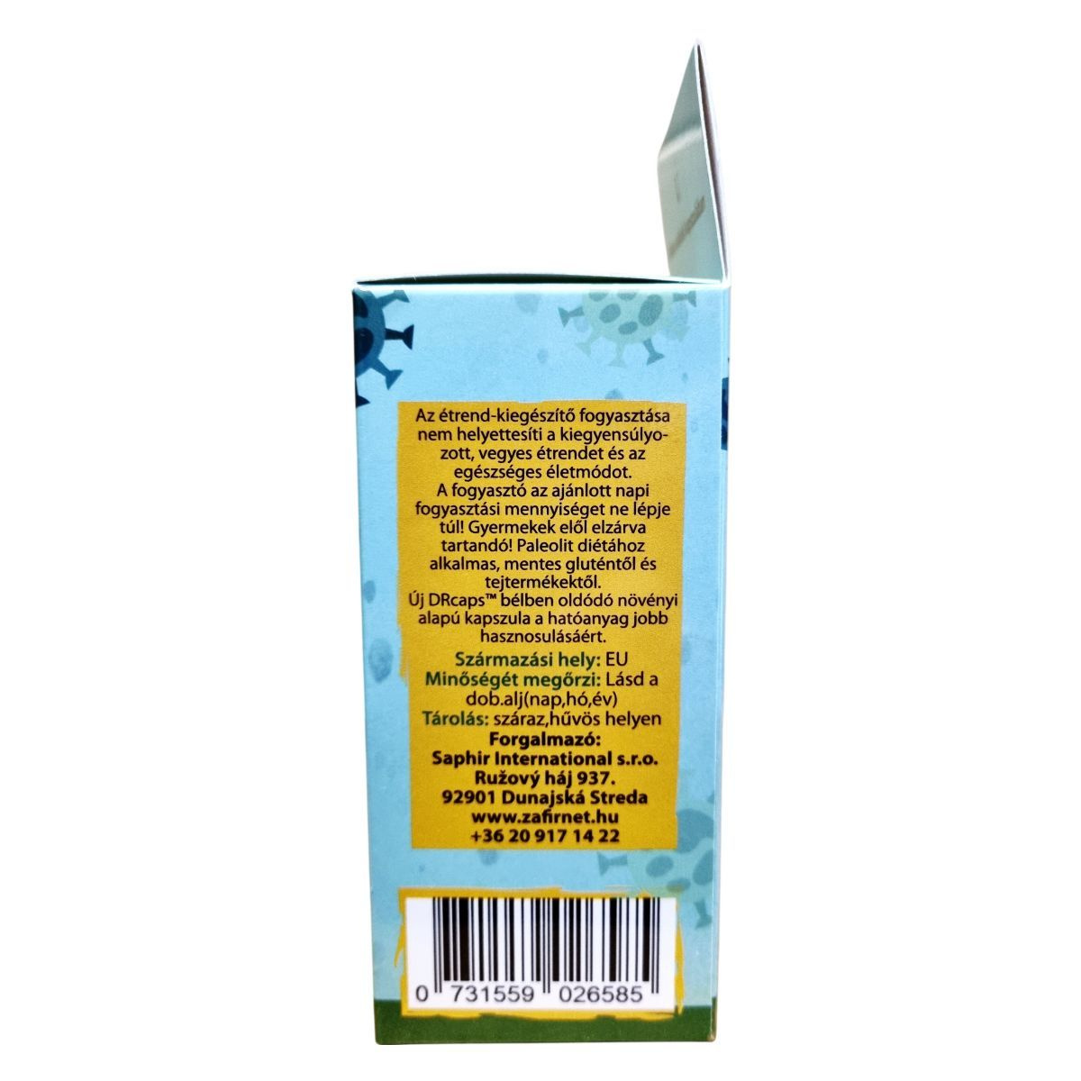 Az étrend-kiegészítő fogyasztása nem helyettesíti a kiegyensúlyozott, vegyes étrendet és az egészséges életmódot. A fogyasztó az ajánlott napi fogyasztási mennyiséget ne lépje túl! Gyermekek elől elzárva tartandó!