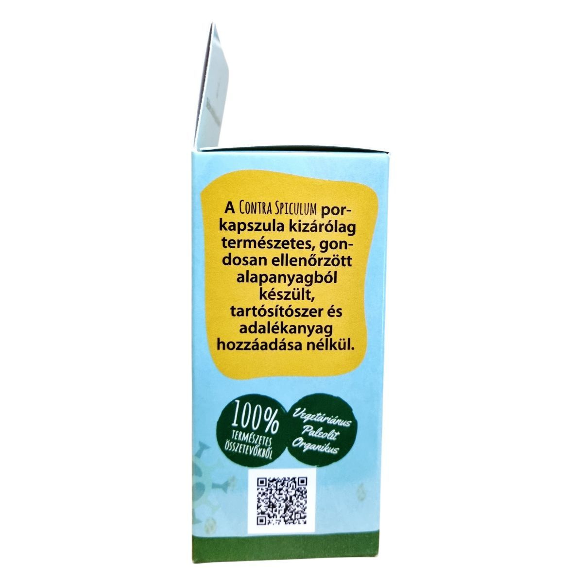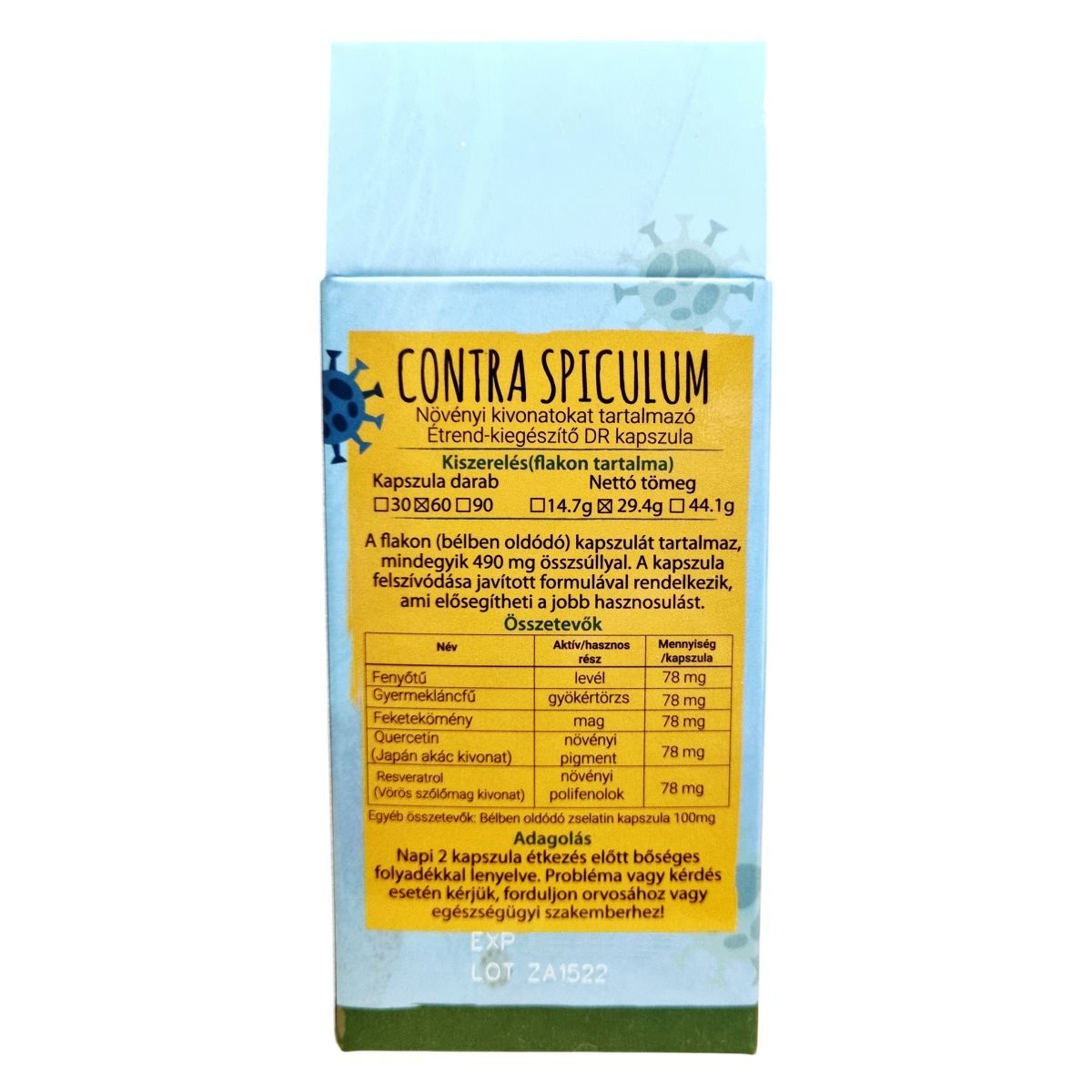 A Zafir CONTRA SPICULUM étrend-kiegészítő bélben oldódó kapszulákban érhető el, amelyek természetes, gondosan ellenőrzött alapanyagokból készültek, tartósítószer és adalékanyag hozzáadása nélkül. A termék 100% természetes összetevőkből áll, és a hatóanyagok jobb hasznosulását segítheti elő. A kapszulák 490 mg összsúllyal rendelkeznek, és a termék származási helye az EU. A forgalmazó elérhetősége: www.zafirnet.hu, +36 20 917 14 22.
