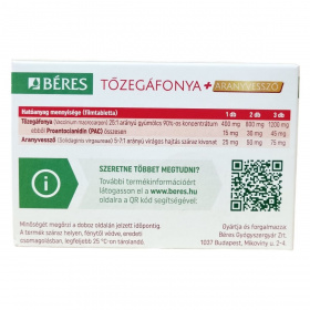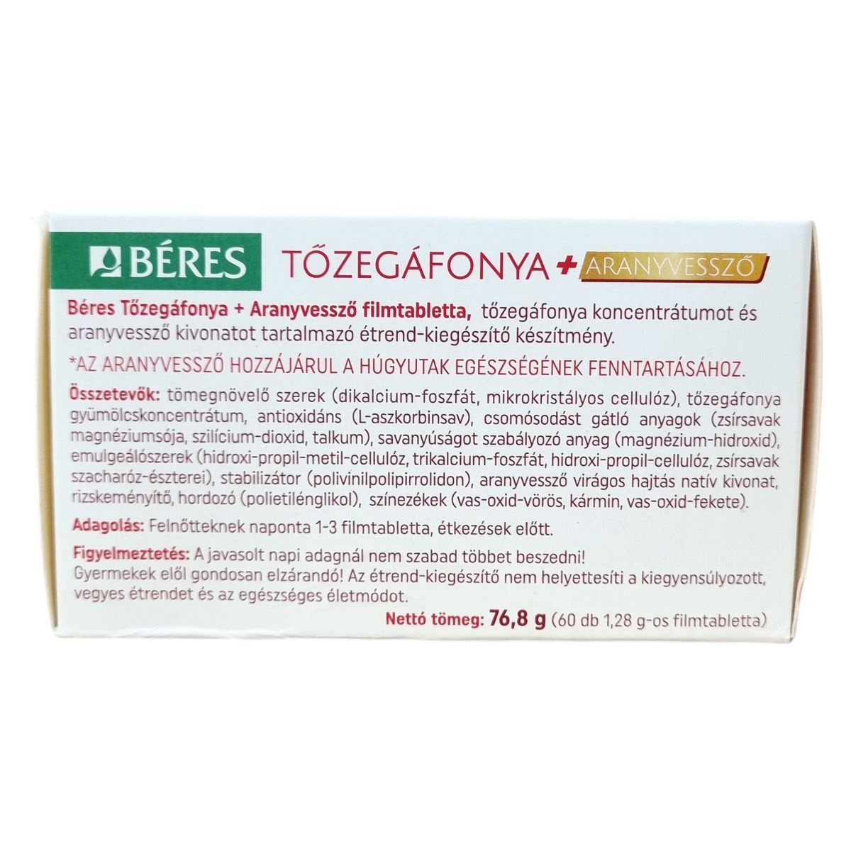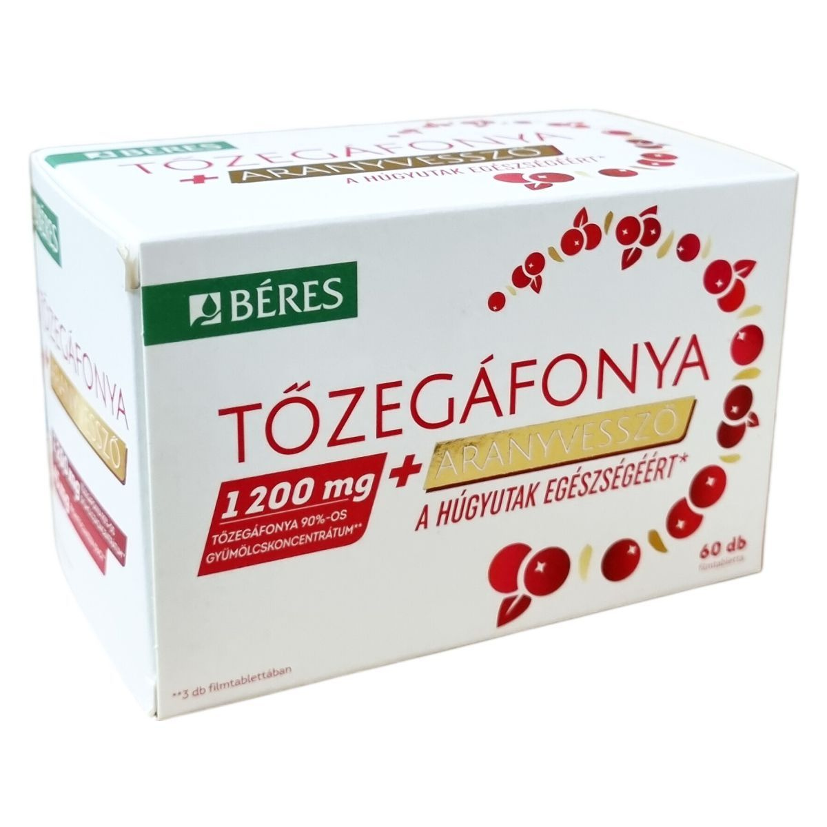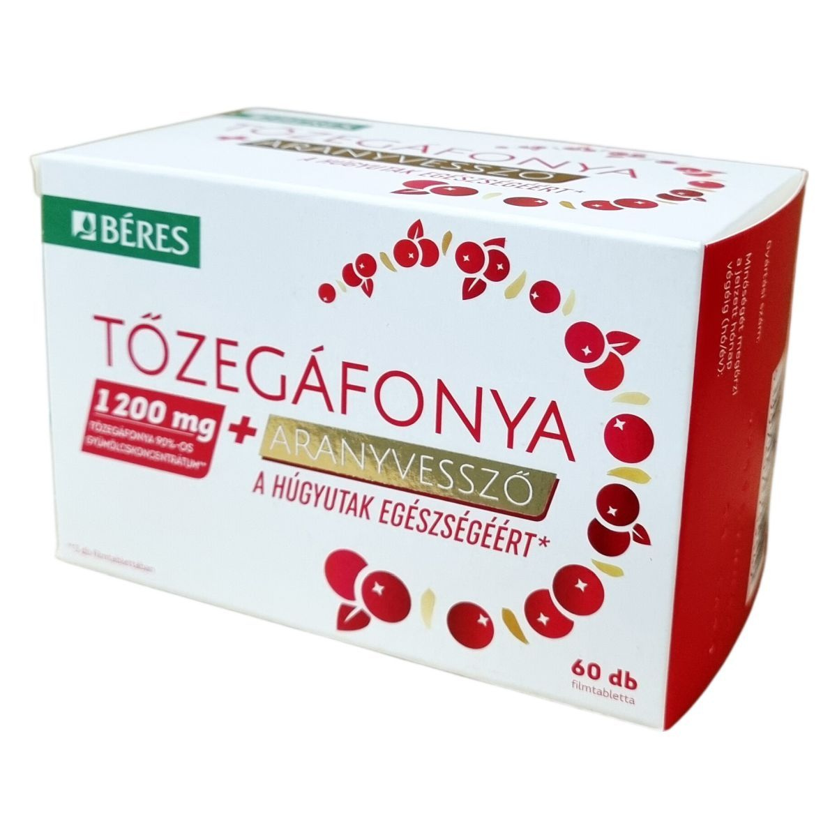 A Béres Tőzegáfonya + Aranyvessző filmtabletta tőzegáfonya koncentrátumot és aranyvessző kivonatot tartalmazó étrend-kiegészítő készítmény. A termék a húgyutak egészségének fenntartásához hozzájárulhat. A dobozban 60 darab, egyenként 1,28 g súlyú filmtabletta található. A tőzegáfonya gyümölcskoncentrátum 25:1 arányban készül, és 90%-os koncentrátumként van jelen a termékben. Az egyik legfontosabb hatóanyag a proantocianidin (PAC), amely 3 tabletta esetén összesen 45 mg mennyiségben van jelen. Az aranyvessző virágos hajtás száraz kivonata 5-7:1 arányú, és 3 tablettában 75 mg van. A termék összetevői között találhatók továbbá tömegnövelő szerek, antioxidánsok, csomósodást gátló anyagok, savanyúságot szabályozó és emulgeálószerek, stabilizátorok, illetve színezékek is. A filmtabletták használatakor a javasolt napi mennyiséget nem szabad túllépni, a készítményt gyermekek elől gondosan védeni kell, és nem helyettesíti a kiegyensúlyozott étrendet és az egészséges életmódot. Tárolása száraz, hűvös, fénytől védett helyen ajánlott.