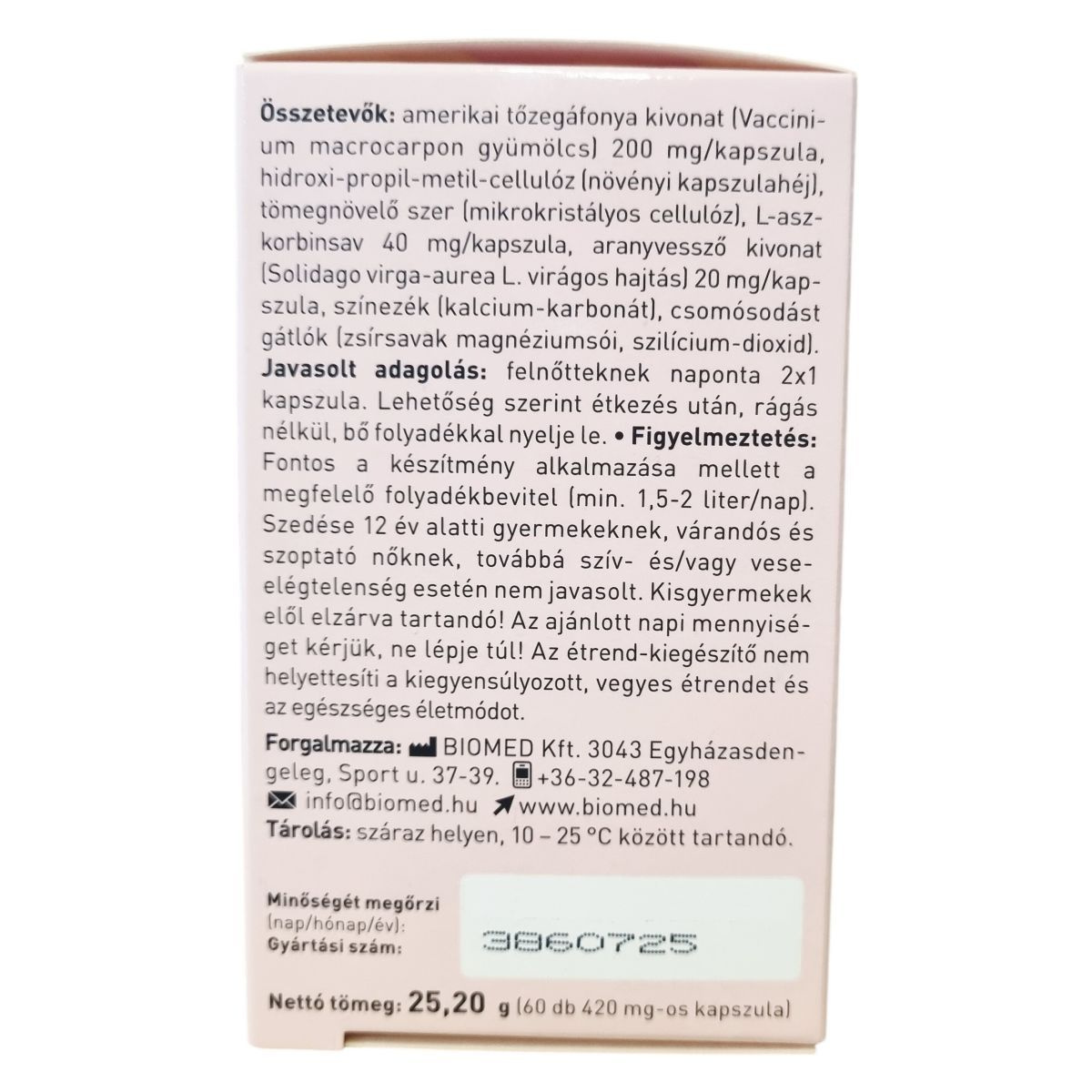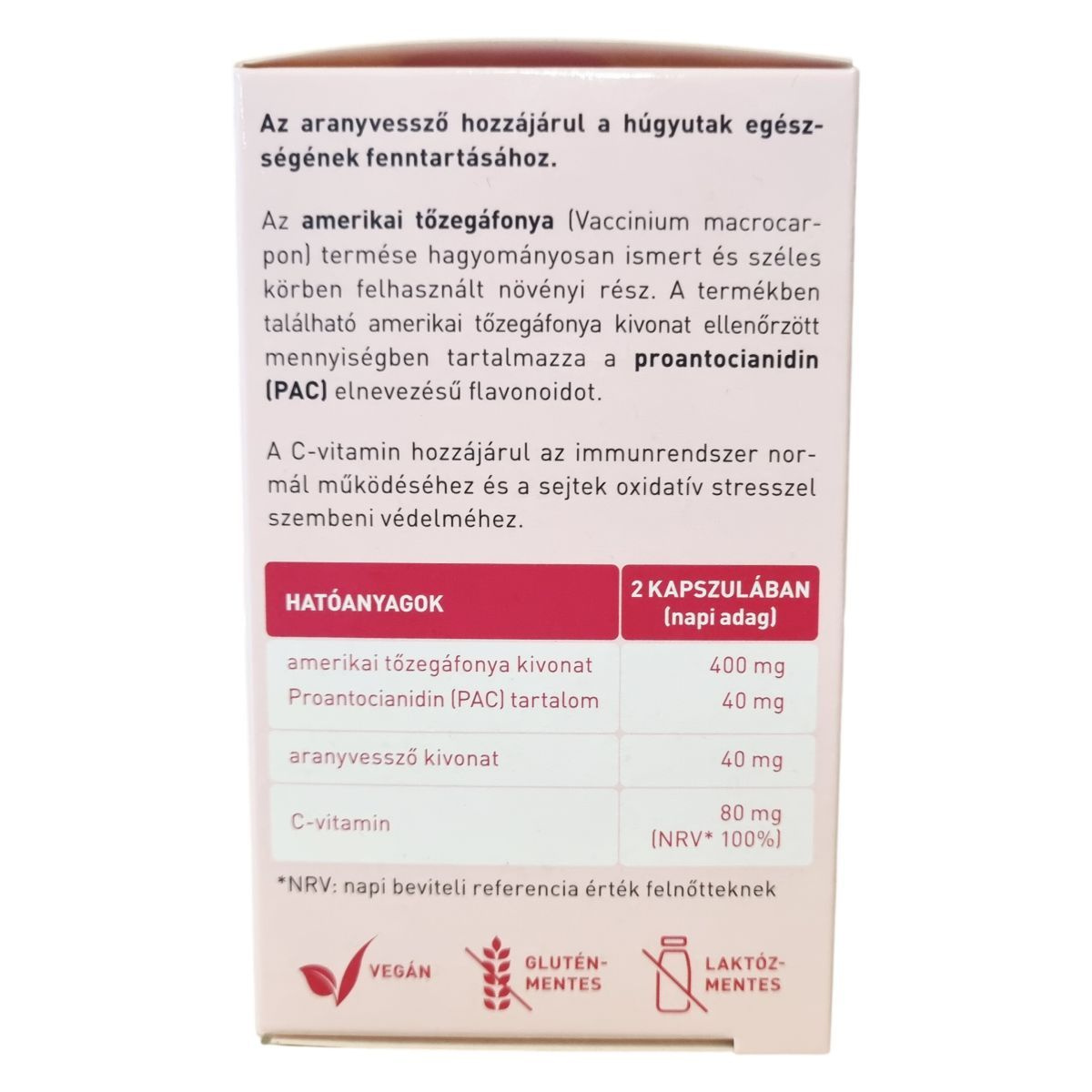 Az amerikai tőzegáfonya termése hagyományosan ismert és széles körben használatos növényi rész, amely a készítményben ellenőrzött mennyiségű proantocianidint tartalmaz. Az aranyvessző hozzájárulhat a húgyutak egészségének fenntartásához. A C-vitamin részt vehet az immunrendszer normál működésében és segítheti a sejtek oxidatív stresszel szembeni védelmét. A kapszula növényi kapszulahéjjal készül, amely vegán, glutén- és laktózmentes formulát biztosít. A termék 25,20 g nettó tömegű, 60 darab 420 mg-os kapszulát tartalmaz.