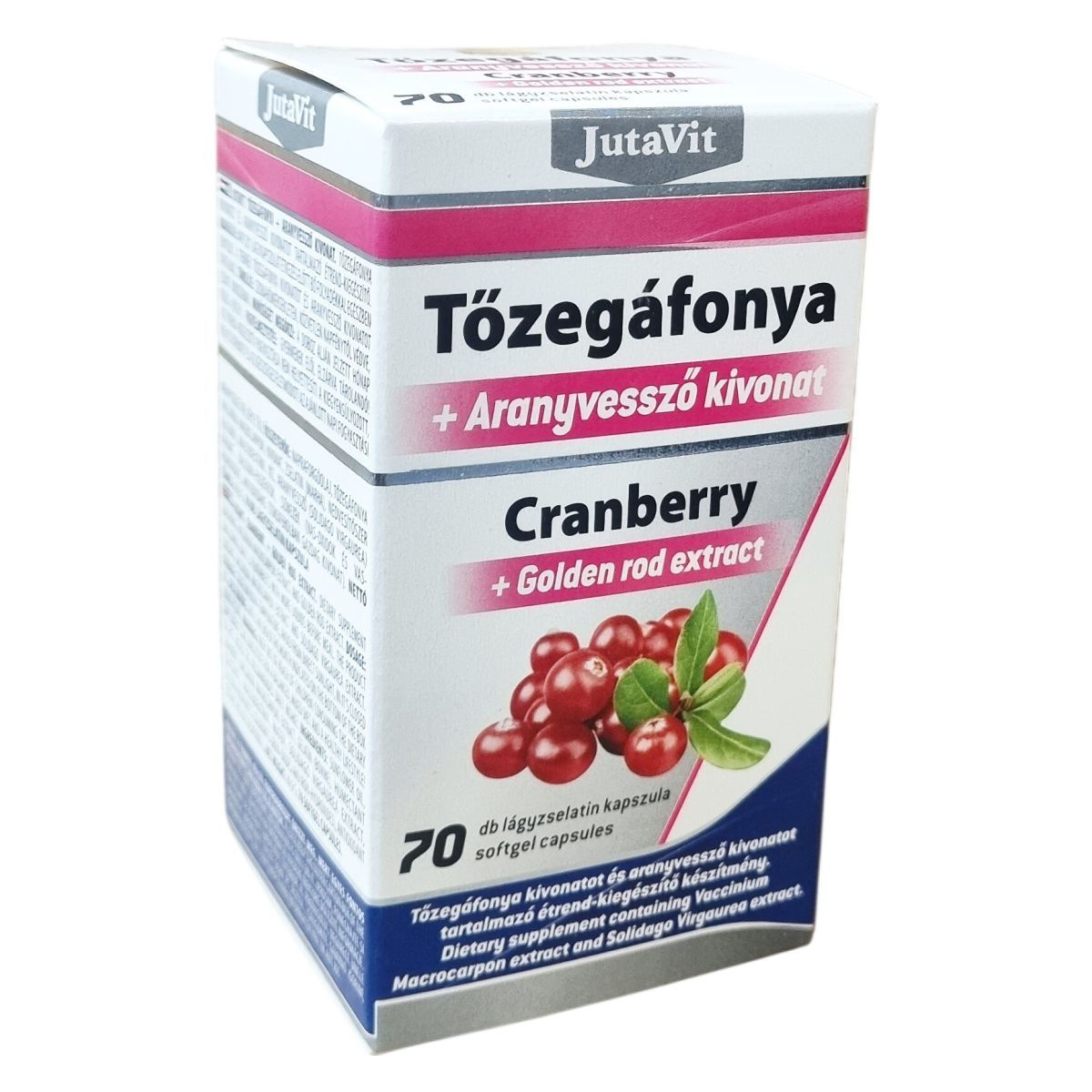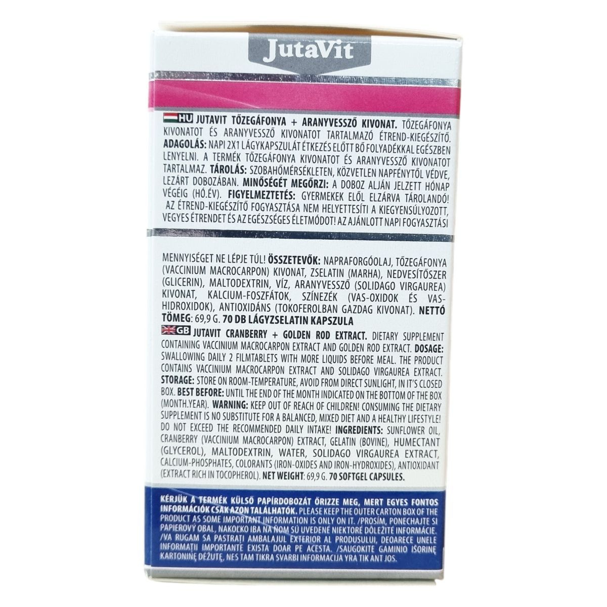 A JutaVit Tőzegáfonya + Aranyvessző kivonat lágyzselatin kapszulában található étrend-kiegészítő készítmény Vaccinium macrocarpon (tőzegáfonya) és Solidago virgaurea (aranyvessző) kivonatot tartalmaz. A napi adag két lágykapszula, melyeket étkezés előtt ajánlott bő folyadékkal lenyelni. A termék összetevői között napraforgóolaj, marha eredetű zselatin, valamint antioxidánsként tokóferolban gazdag kivonat szerepel. A készítményt szobahőmérsékleten, napfénytől védve, gyermekektől elzárva kell tárolni. A táplálékkiegészítő nem helyettesíti a változatos étrendet és az egészséges életmódot, illetve az ajánlott napi adagot nem szabad túllépni. A termék nettó tömege 69,9 g, mely 70 darab lágyzselatin kapszulát tartalmaz. A gyártó a Juvapharma Kft., Magyarország.