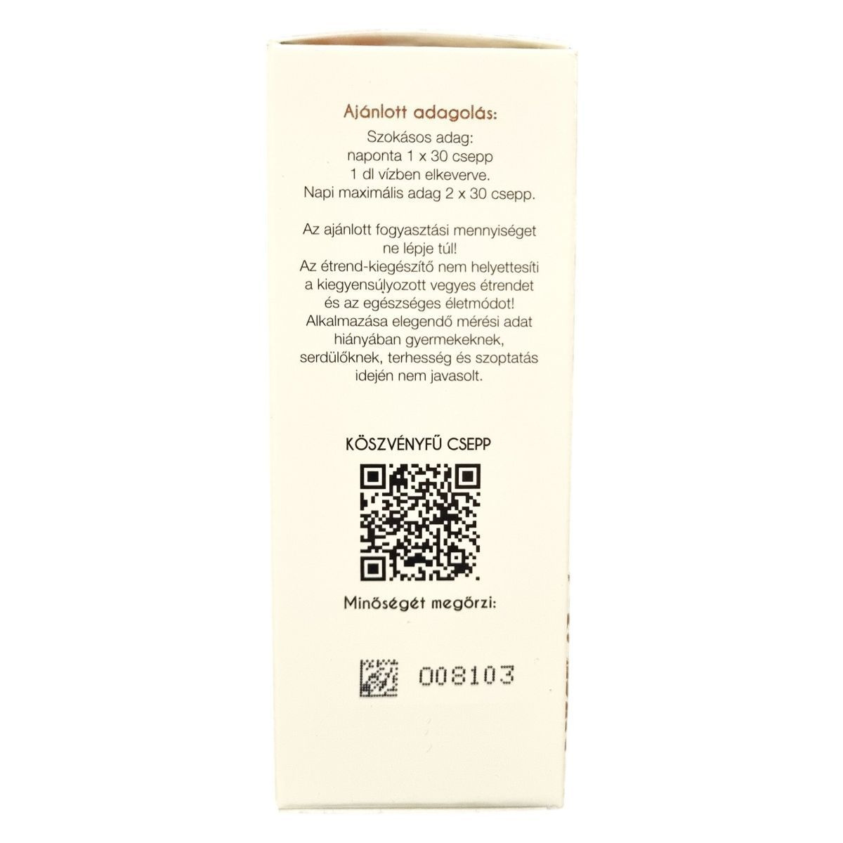 A termék 33 térfogatszázalékos alkoholt tartalmazó, 50 ml-es folyékony étrend-kiegészítő. A termékben előfordulhat üledékesedés, amely nem befolyásolja a minőségét. A Köszvényfű csepp különféle gyógynövényeket tartalmaz, mint például köszvényfű, kötörőfű, mezei zsurló, tyúkhúr, sáfrányos szeklice, őszi margitvirág és fehér mályva. A termék Magyarországon készül.