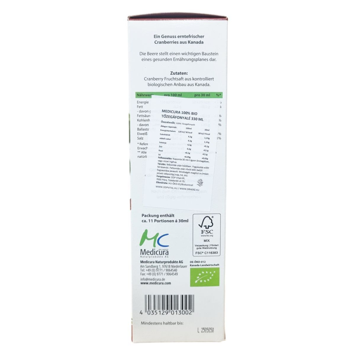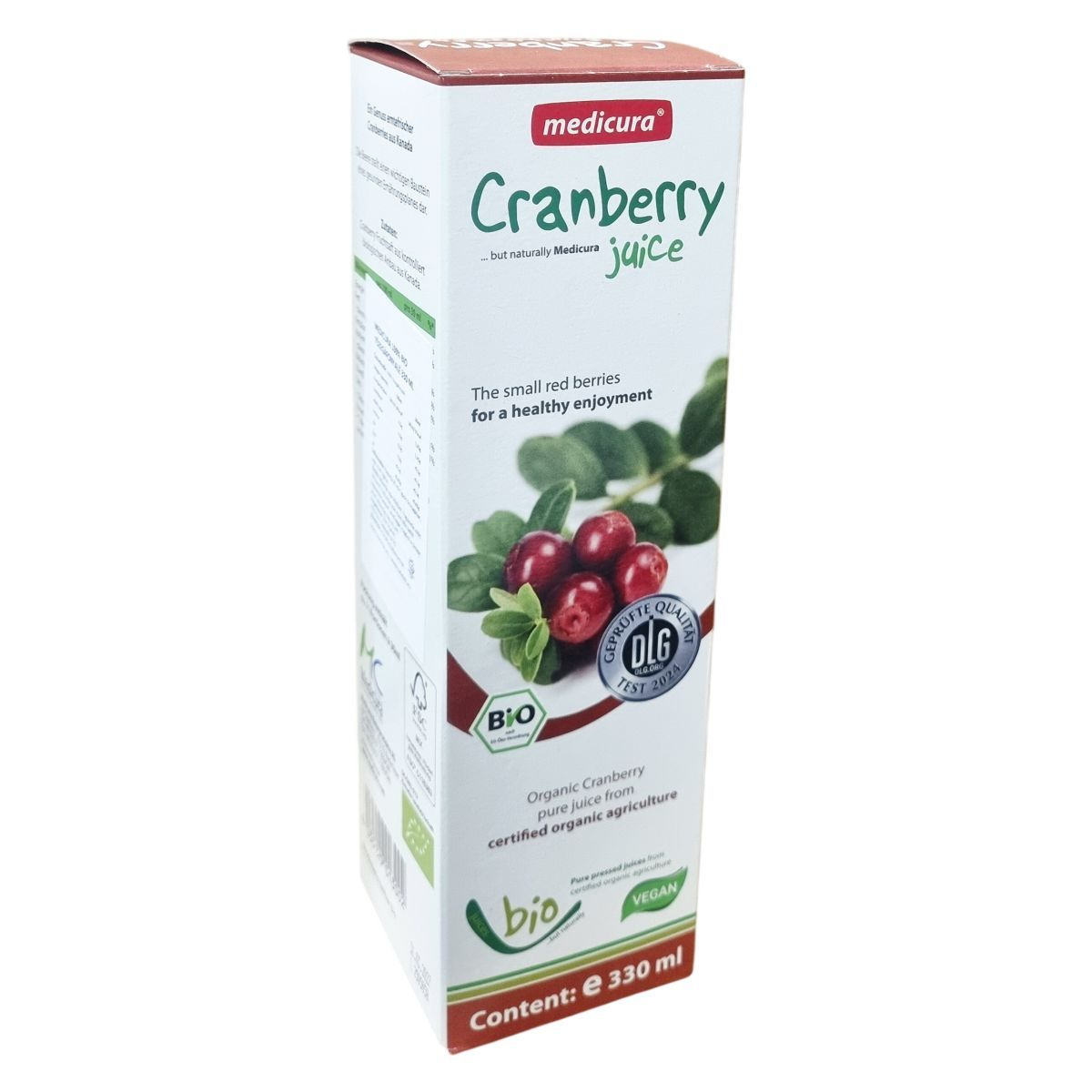 A medicura® Cranberry tiszta, préselt tőzegáfonya levet tartalmaz, amely ellenőrzött biogazdálkodásból származik és Kanadából származó friss termésből készül. A tőzegáfonya fontos része egy egészséges étrendnek, a termék vegán és bio minősítésű. A csomagolás FSC tanúsítvánnyal rendelkezik, támogatva a fenntartható erdőgazdálkodást. A palack tartalma körülbelül 11 adag 30 ml-enként.
