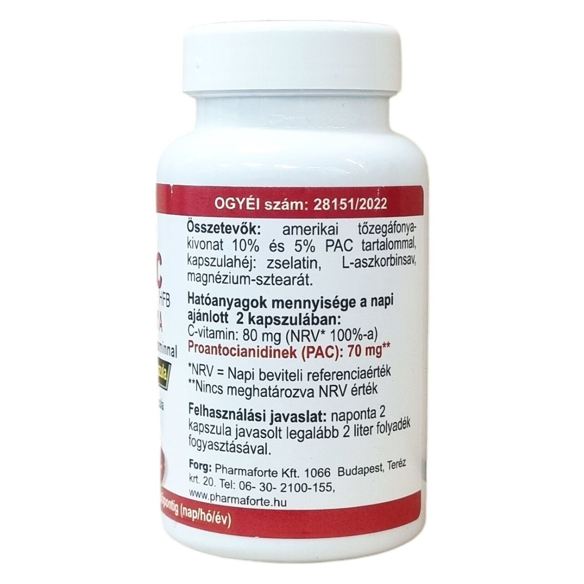 amerikai tőzegáfonya-kivonat 10% és 5% PAC tartalommal, kapszulahéj: zselatin, L-aszkorbinsav, magnézium-sztearát