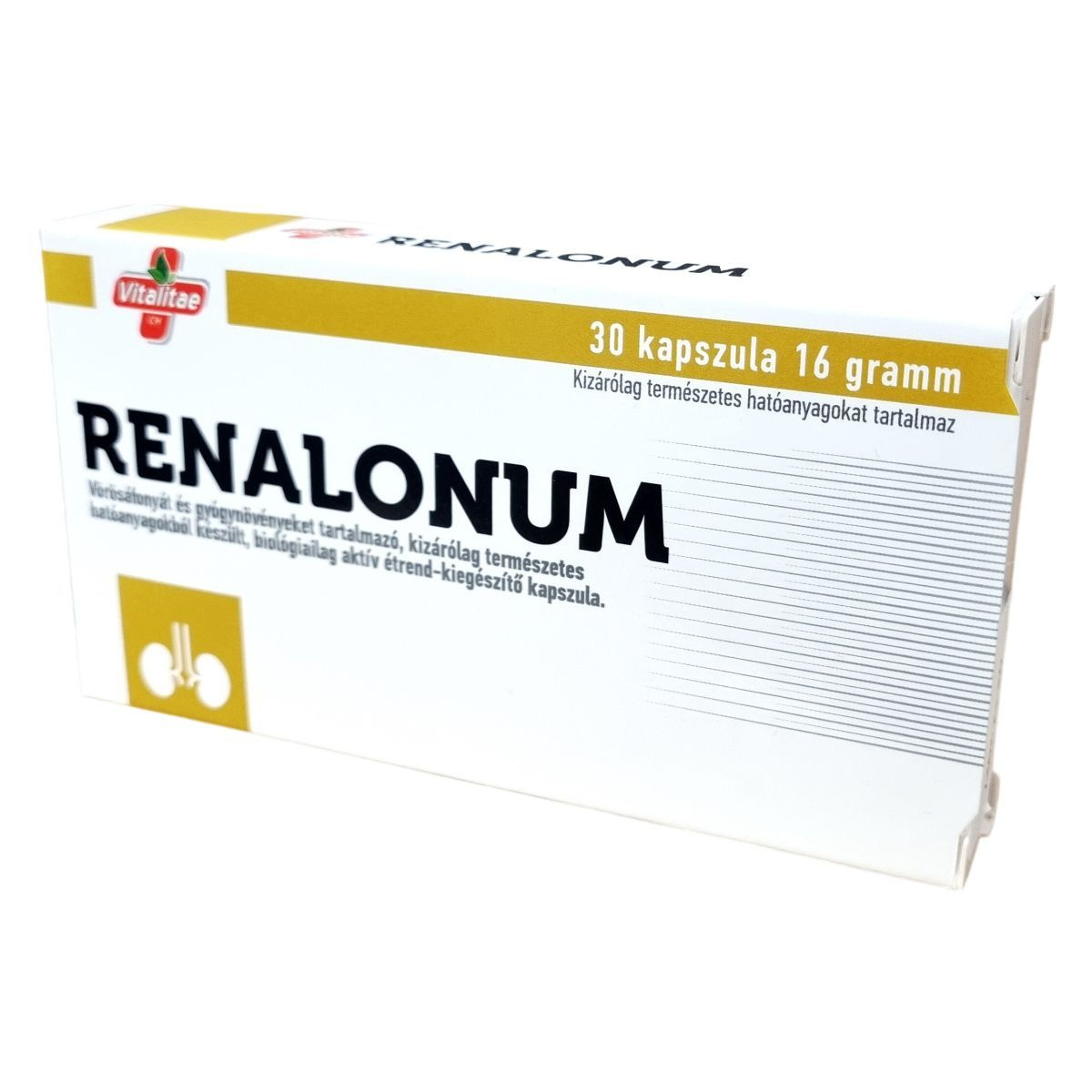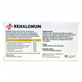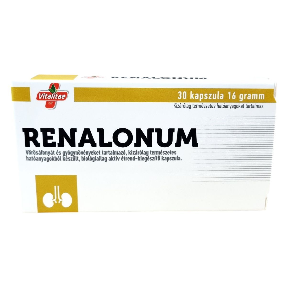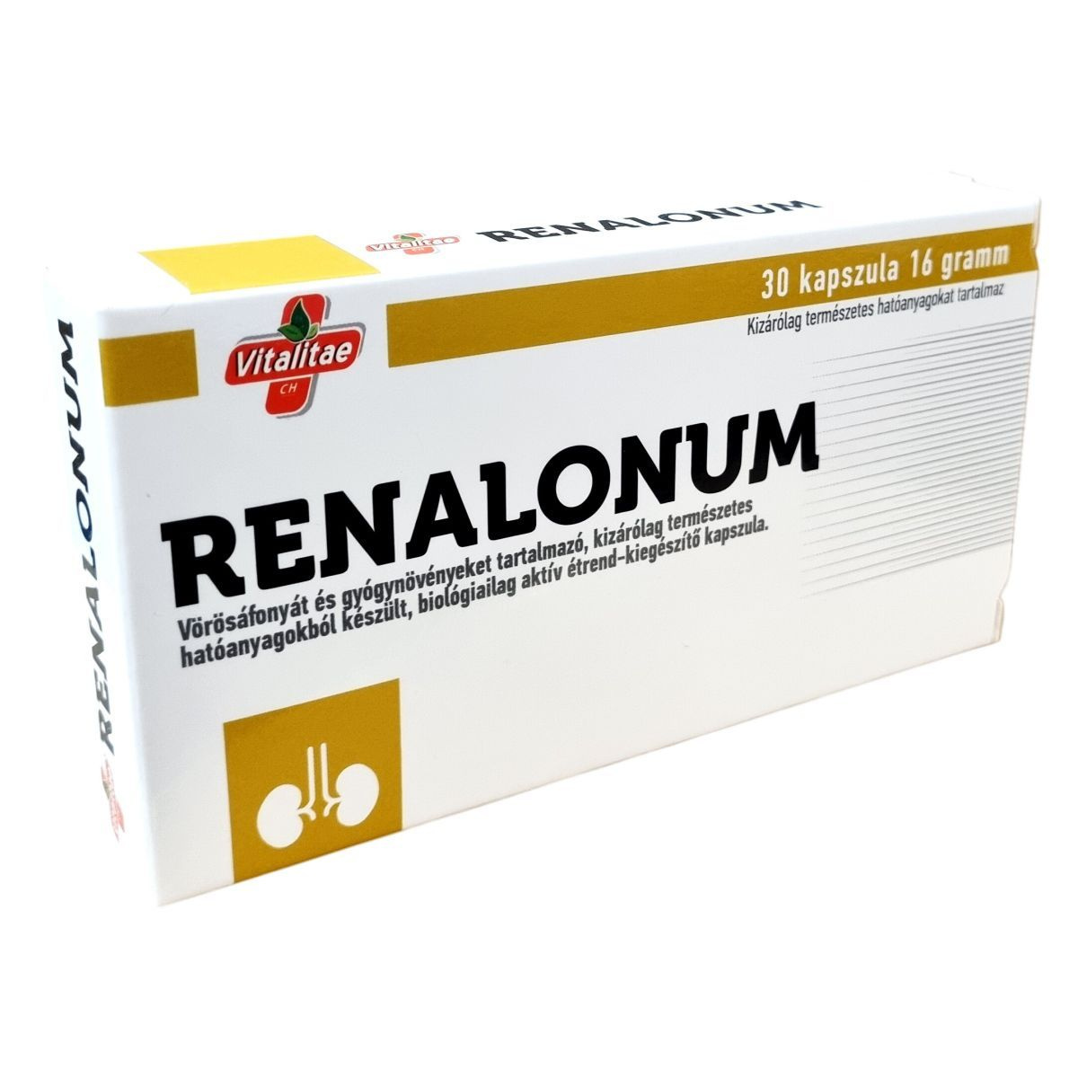 A Vitalitae CH RENALONUM kapszula egy biológiailag aktív étrend-kiegészítő, amely kizárólag természetes alapanyagokból készül. Fő összetevői között vörösáfonya kivonat, valamint többféle gyógynövény és természetes vegyület található, mint az alga eredetű kalcium, jávatea, nyírfalevél, bodzavirág és aranyvessző kivonatok, továbbá prolin és L-glutaminsav. Ezek az alkotók egymással összhangban segíthetik a szervezet egészséges működését. A kapszula formában történő alkalmazás lehetővé teszi az egyszerű és kényelmes használatot. A készítmény gyártója a BerthaPharma-Technology Kft., amely Magyarországon, Tormaföldén található. A termék minőségét a csomagoláson feltüntetett időpontig megőrzi.
