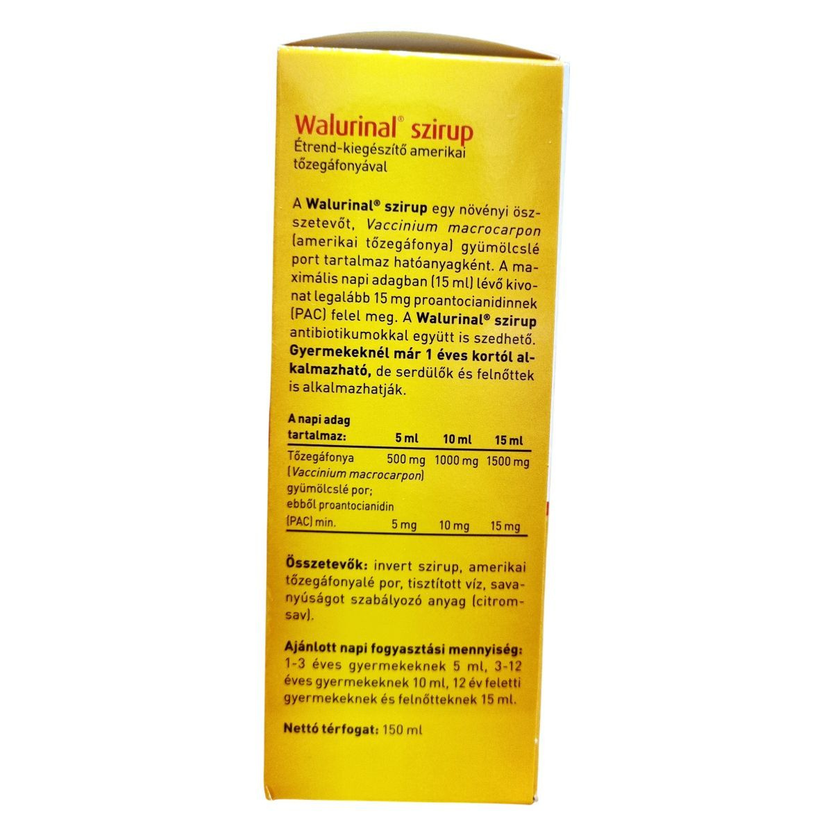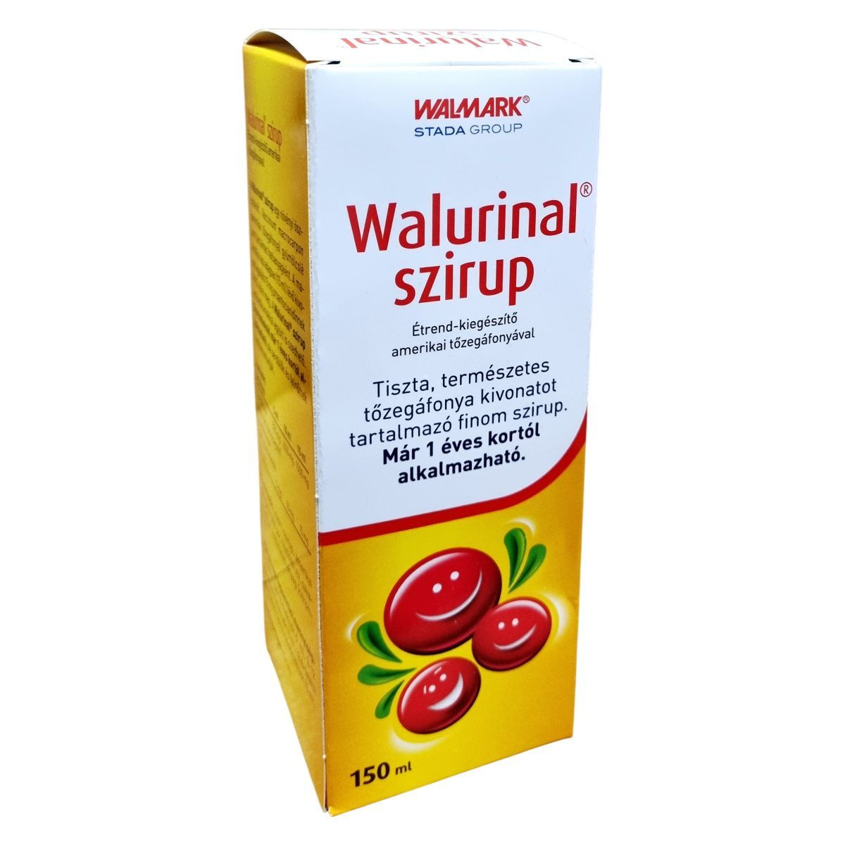 A Walurinal® szirup egy étrend-kiegészítő, amely amerikai tőzegáfonya kivonatot tartalmaz. A termék fő hatóanyaga a Vaccinium macrocarpon gyümölcslé por, amely proantocianidint (PAC) tartalmaz. A szirup már 1 éves kortól alkalmazható, és antibiotikumokkal együtt is szedhető. A termék 150 ml-es kiszerelésben kapható, és a napi adagolás a korosztálytól függően változik. A szirup invert szirupot, tisztított vizet és citromsavat is tartalmaz. Fontos, hogy a terméket száraz, sötét helyen, 10 – 25°C közötti hőmérsékleten tároljuk, és a felbontást követő 3 hónapon belül használjuk fel. A gyártó Walmark, a.s., a forgalmazó pedig a Stada Hungary Kft.