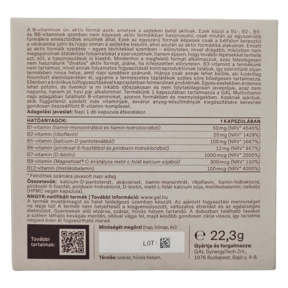 A B-vitaminok ún. aktív formái azok, amelyek a sejtekben belül aktívak. A GAL B-komplex kizárólag ilyen aktív formákat tartalmaz, amelyek jobban hasznosulnak, mint az egyszerűbb formák. Nem tartalmaz B3-vitamint, mivel a megfelelő táplálkozás esetén abból nincs hiány. A termék a GAL Multivitamin napi adagjának megfelelő mennyiségben tartalmazza a B-vitaminokat. TÜV / ISO 9001:2015 tanúsított folyamatok előírásai szerint készült termék. 60 kapszula, 22,3 g.
