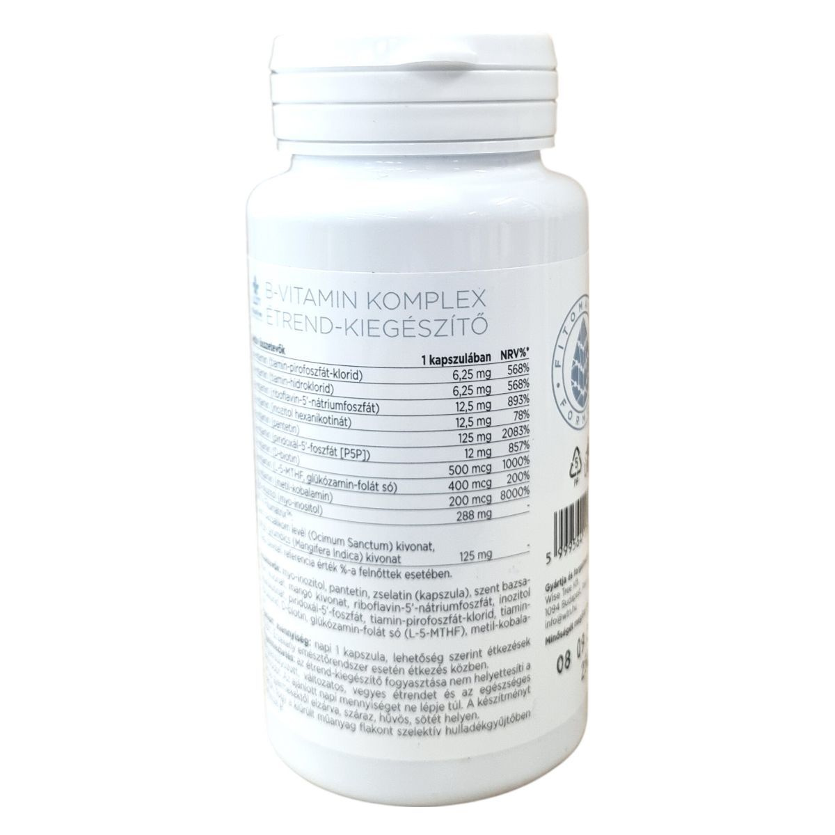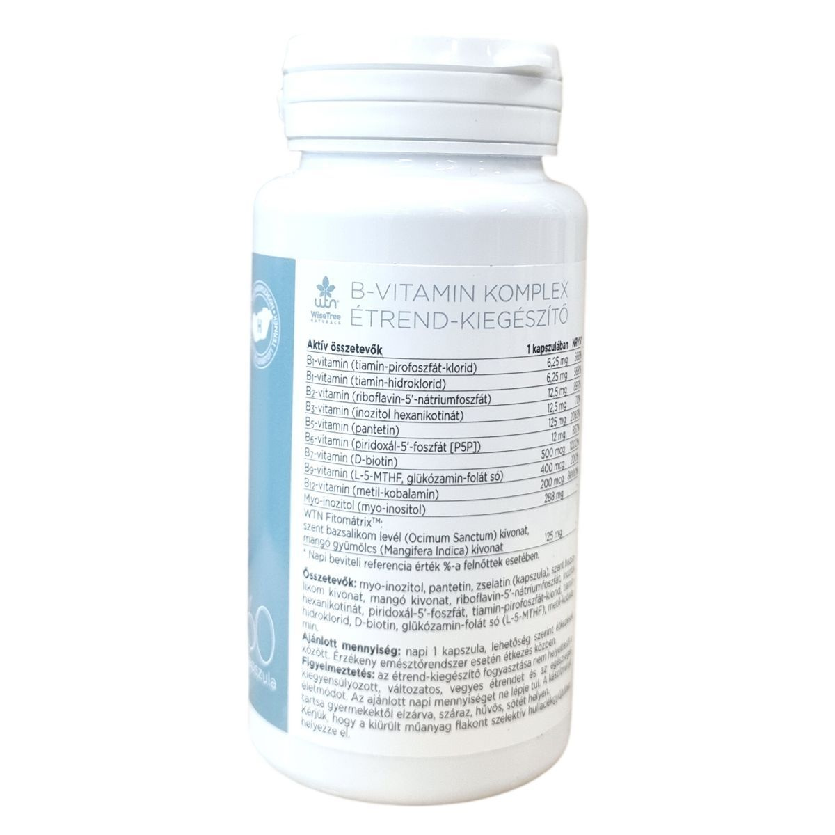 A WiseTree Naturals B-vitamin komplex étrend-kiegészítő kapszula biológiailag aktív B-vitaminokat tartalmaz, mint a tiamin-pirofoszfát-klorid és tiamin-hidroklorid (B1-vitamin), riboflavin-5'-nátriumfoszfát (B2-vitamin), inozitol hexanikotinat (B3-vitamin), pantetin (B5-vitamin), piridoxál-5'-foszfát (B6-vitamin), D-biotin (B7-vitamin), L-5-MTHF, glükózamin-folát só (B9-vitamin) és metil-kobalamin (B12-vitamin). Egy kapszula továbbá 288 mg myo-inozitol és a WTN Fitomátrix™ formula részeként szent bazsalikom levél és mangó gyümölcs kivonatát tartalmazza. A termék formája zselatin kapszula, a csomagolás 60 kapszulát tartalmaz. Az aktív hatóanyagok mennyisége jelentősen meghaladja a napi beviteli referencia értéket. A készítmény a kiegyensúlyozott táplálkozás részét képezheti, és ajánlott a napi egy kapszula fogyasztása, lehetőség szerint étkezések között, vagy érzékeny emésztőrendszer esetén étkezés közben. A kapszula támogatni tudja a szervezet B-vitamin ellátását, és hozzájárulhat az anyagcseréhez, idegrendszer működéséhez, valamint az energiaszint fenntartásához.