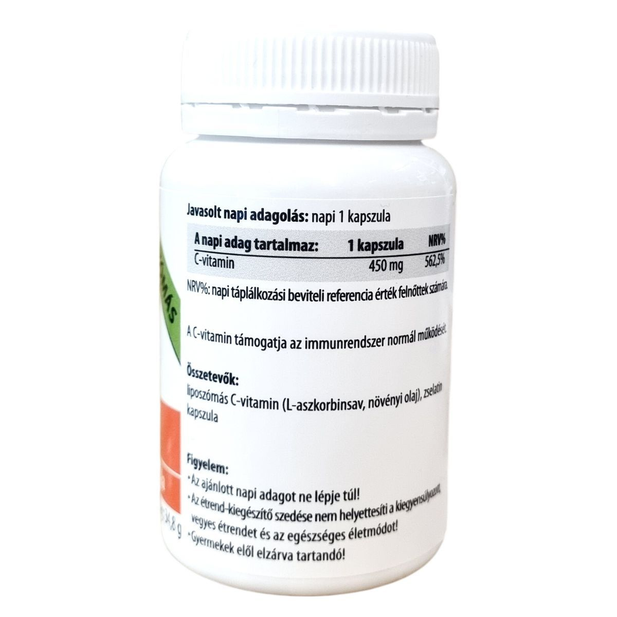 A termék nettó tömege a csomagoláson fel van tüntetve, és 60 darab kapszulát tartalmaz. A napi adagban található 450 mg C-vitamin a felnőttek számára ajánlott napi táplálkozási referencia érték több mint 560%-át fedezheti. A liposzómás technológia révén a C-vitamin hatékonyabb felszívódása érhető el. A termék minőségét a csomagoláson található minőségmegőrzési időig tartja meg. A képen szereplő vonalkód azonosító és a forgalmazó adatai megerősítik a termék eredetét. A fogyasztók számára fontos, hogy figyeljenek az ajánlott adag betartására és a termék használata mellett fenntartsák a kiegyensúlyozott étrendet és életmódot.