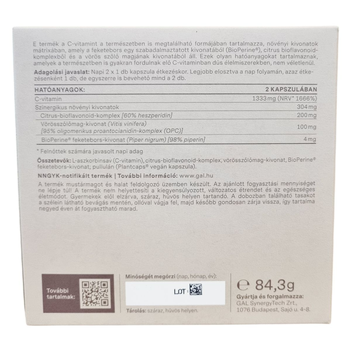 Ez a termék a C-vitamint a természetben is megtalálható formájában tartalmazza, növényi kivonatok mátrixában, amely a fekete bors egy szabadalmaztatott kivonatából (BioPerine®), citrus bioflavonoid-komplexből és a vörös szőlő magjának kivonatából áll. Ezek olyan hatóanyagokat tartalmaznak, amelyek a természetben is gyakran fordulnak elő C-vitaminban dús élelmiszerekben. A GAL egy tiszta alapanyagokból készülő, minőségi vitaminmárka. Hiszünk a természet és az ember szimbiózisában, a fenntartható fejlődésben és a jól megélt mindennapokban. TÜV | ISO 9001:2015 tanúsított folyamatok előírásai szerint készült termék.