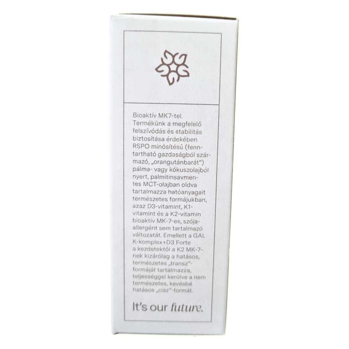 Bioaktív MK7-tel. Termékünk a megfelelő felszívódás és stabilitás érdekében RSPO minősítésű („orangutánbarát”), fenntartható gazdaságból származó pálma- vagy kókuszolajból nyert, palmitinsavmentes MCT-olajban oldva tartalmazza hatóanyagait természetes formájukban: D3-vitamin, K1-vitamin, valamint K2-vitamin bioaktív MK-7-es, szójaallergént sem tartalmazó változata. A GAL K-komplex + D3 Forte a kezdetektől kizárólag a K2 MK-7 hatásos, természetes „transz” formáját tartalmazza, elkerülve a kevésbé hatékony „cisz” formát.