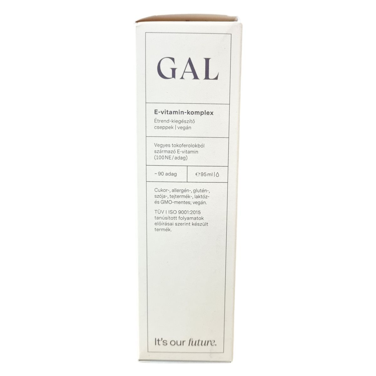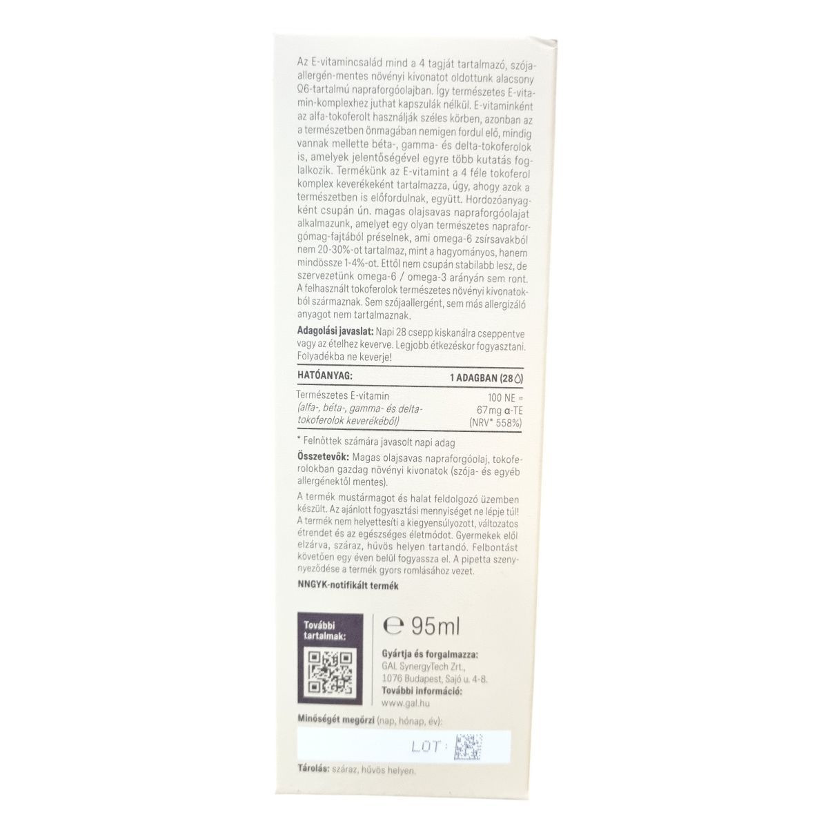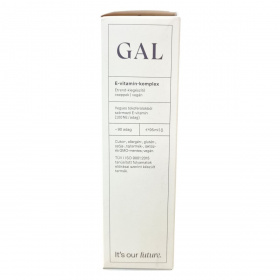 A GAL E-vitamin-komplex terméke természetes, vegyes tokoferolokból álló E-vitamin-komplexet tartalmaz, amely a természetben előforduló alfa-, béta-, gamma- és delta-tokoferolokat egyaránt magában foglalja. Ezek a tokoferolok tiszta növényi kivonatokból származnak, és szójaallergén-mentesek. A termék egyedülálló módon alacsony omega-6 tartalmú, magas olajsavas napraforgóolajban oldott, amely omega-6 zsírsavakból csupán 1-4%-ot tartalmaz, így nem befolyásolja kedvezőtlenül a szervezet omega-6 / omega-3 arányát, és hozzájárulhat az E-vitamin természetes formában történő pótlásához kapszulák nélkül. A termék nem tartalmaz cukrot, allergéneket, glutént, szóját, tejterméket, laktózt, valamint GMO-mentes is, és vegán étrendbe illeszthető. A termék nem helyettesíti a kiegyensúlyozott étrendet, és az egészséges életmód fontos része lehet. A tiszta alapanyagokból készülő GAL vitaminmárka a természet és az ember szimbiózisában hisz, a fenntarthatóságot és a jól megélt mindennapokat támogatja.