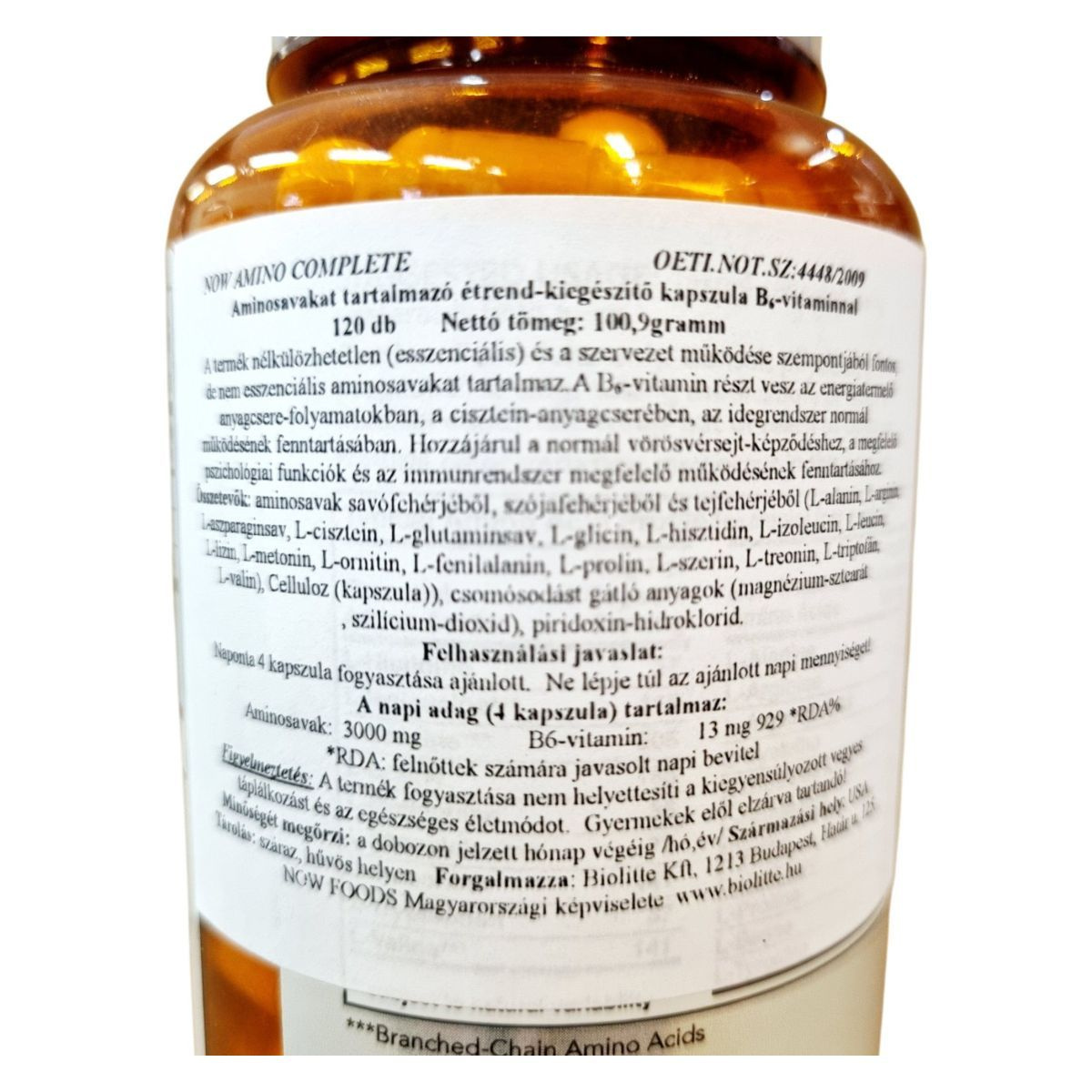 A NOW SPORTS AMINO COMPLETE™ egy aminosavakat tartalmazó étrend-kiegészítő, amely B6-vitaminnal van dúsítva. A termék esszenciális és nem esszenciális aminosavakat tartalmaz, amelyek hozzájárulhatnak a szervezet normál működéséhez. A B6-vitamin részt vehet az energia-anyagcsere folyamatokban, a cisztein-anyagcserében, és támogathatja az idegrendszer normál működését. A termék savófehérjéből, szójafehérje-izolátumból és nátrium-kazeinátból származó aminosavakat tartalmaz, és GMP minősítésű létesítményben készült. A termék fogyasztása különösen ajánlott sportolók és aktív életmódot folytatók számára.