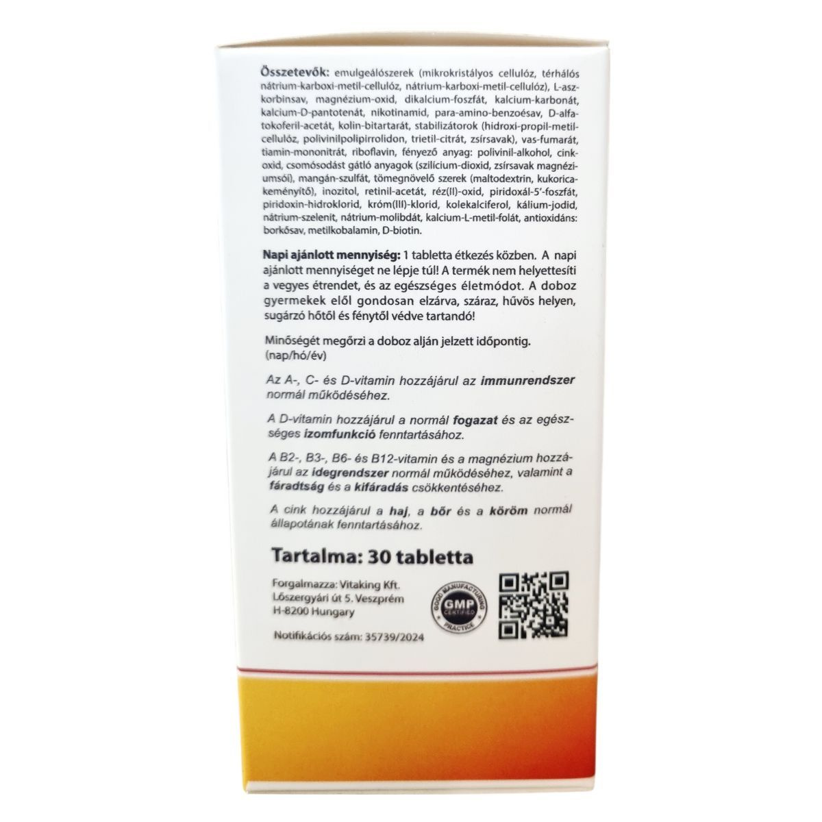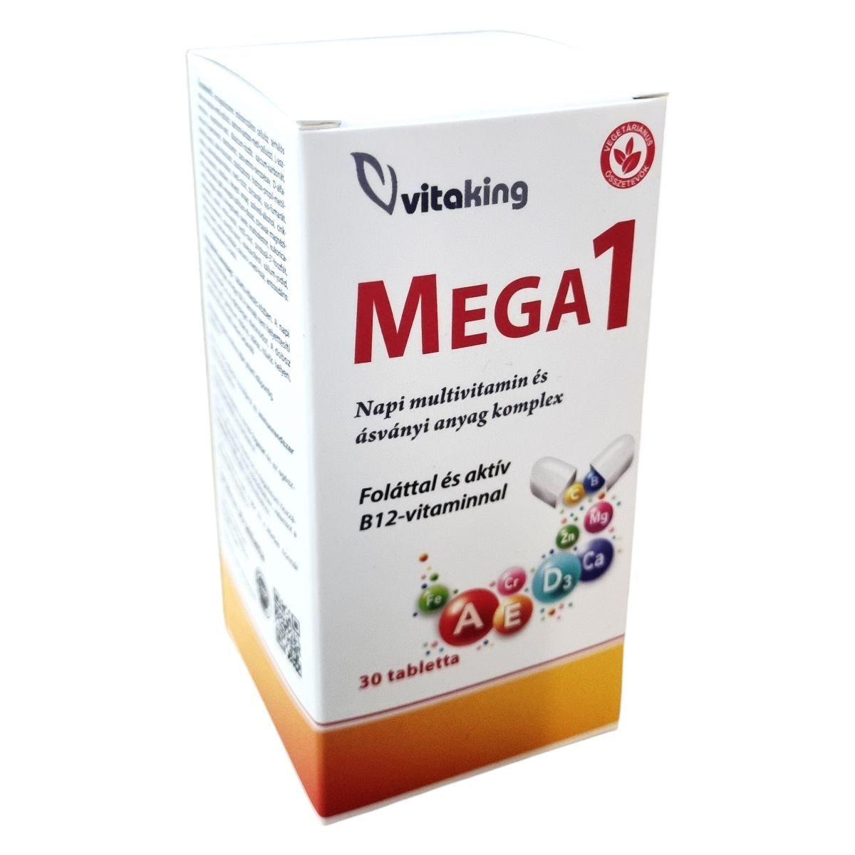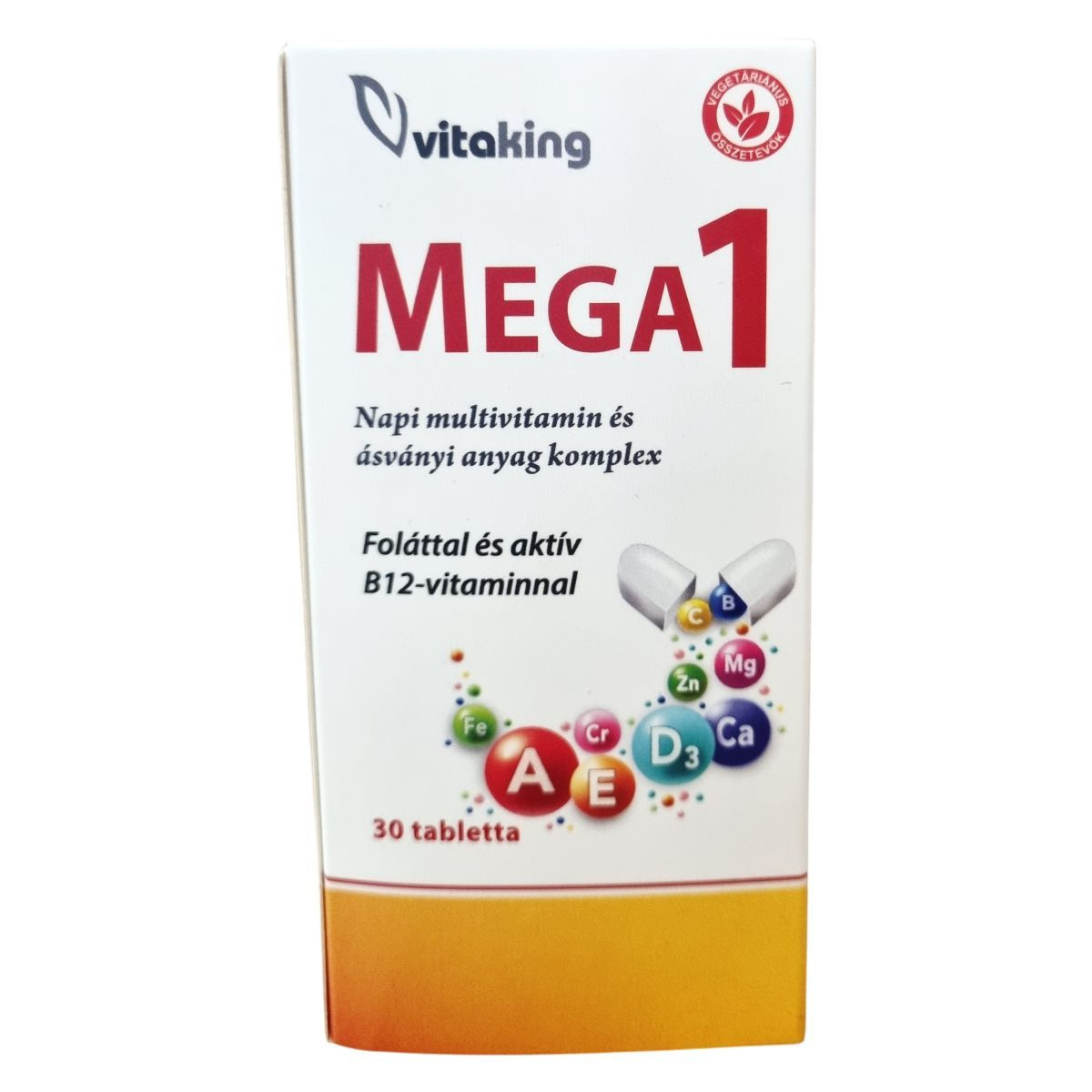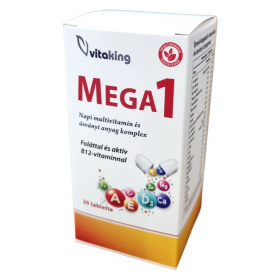 A Vitaking MEGA1 egy napi multivitamin és ásványi anyag komplex, amely folátot és aktív B12-vitamint tartalmaz, valamint A-, C-, D-, E-vitaminokat és ásványi anyagokat, mint a cink, jód, króm, magnézium, mangán, molibdén, réz, szelén és vas. Ezek a hatóanyagok hozzájárulhatnak az immunrendszer, az idegrendszer, az egészséges izmok és fogak működéséhez, valamint a haj, a bőr és a körmök normál állapotának fenntartásához. A készítmény emulgeálószereket, stabilizátorokat és antioxidánst is tartalmaz, amelyek a termék minőségének megőrzését szolgálják. A napi ajánlott mennyiség egy tabletta, mely étkezés közben fogyasztandó. Fontos, hogy a termék nem helyettesíti a kiegyensúlyozott étrendet és az egészséges életmódot.