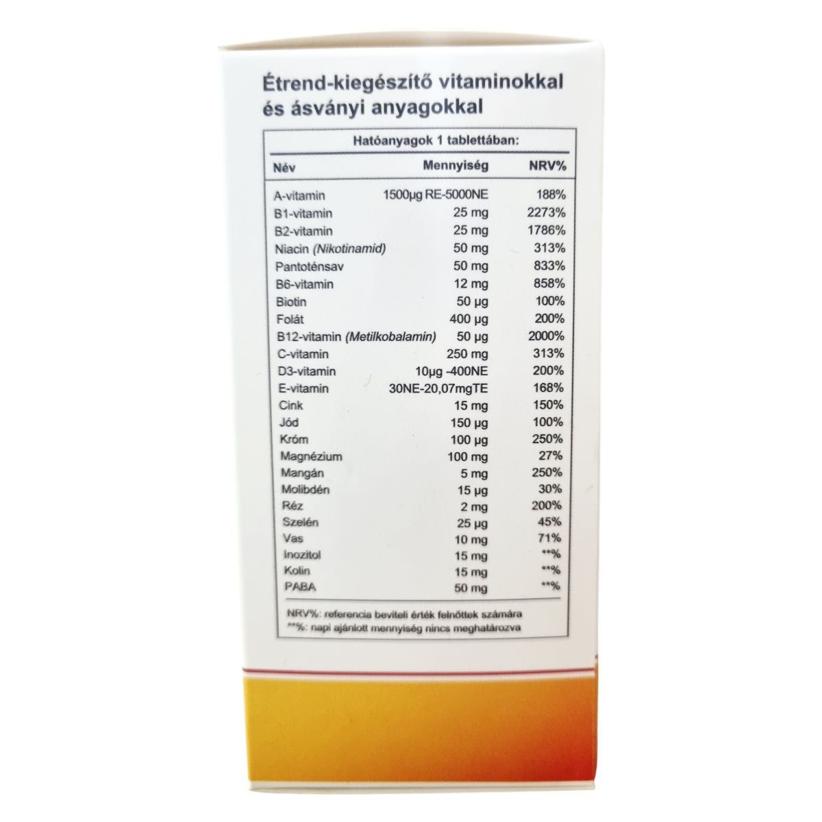 emulgeálószerek (mikrokristályos cellulóz, térhálós nátrium-karboxi-metil-cellulóz, nátrium-karboxi-metil-cellulóz), L-aszkorbinsav, magnézium-oxid, dikalcium-foszfát, kalcium-karbonát, kalcium-D-pantotenát, nikotinamid, para-amino-benzoesav, D-alfa-tokoferil-acetát, kolin-bitartrát, stabilizátorok (hidroxipropil-metil-cellulóz, polivinilpolipirrolidon, trietil-citrát, zsírsavak), vas-fumarát, tiamin-mononitrát, riboflavin, fényező anyag: polivinil-alkohol, cink-oxid, csomósodást gátló anyagok (szilícium-dioxid, zsírsavak magnéziumsói), mangán-szulfát, tömegnövelő szerek (maltodextrin, kukoricakeményítő), inozitol, retinil-acetát, réz(II)-oxid, piridoxál-5'-foszfát, piridoxin-hidroklorid, króm(III)-klorid, kolekalciferol, kálium-jodid, nátrium-szelenit, nátrium-molibdát, kalcium-L-metil-folát, antioxidáns: borkősav, metilkobalamin, D-biotin.