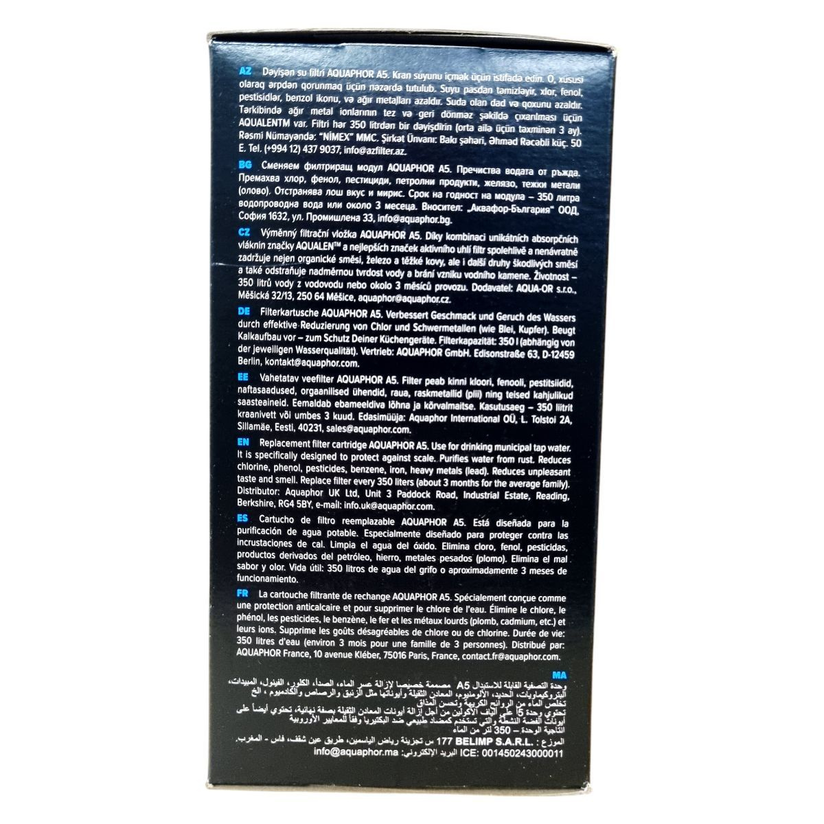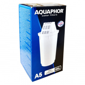 Az AQUAPHOR A5 csere szűrőbetétet ivóvíz szűrésére, csapvíz tisztítására használják, különösen a vízkő és rozsdás lerakódások elleni védelemre. Kb. 350 liter vagy három hónap használat után cserélendő, átlagos családok számára.