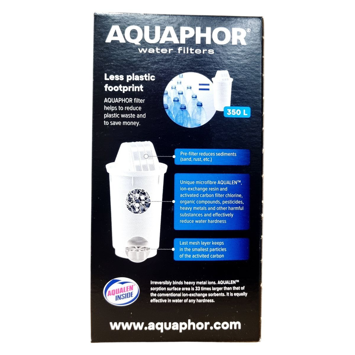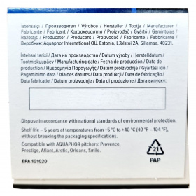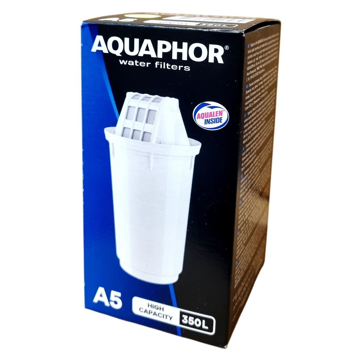 Az AQUAPHOR A5 szűrőbetét a csapvíz tisztítására szolgál, a vízben lévő rozsdát, klórt, fenolt, peszticideket, benzolt, vasat és nehézfémeket (pl. ólom) hatékonyan távolítja el. A különleges AQUALEN™ szűrőanyag révén a nehézfém ionok visszafordíthatatlanul kötődnek meg, és a szűrőanyag felszíne több mint 30-szor nagyobb, mint a hagyományos ioncserélőké, így minden vízkeménységtől függetlenül hatékony. A termék csökkenti a víz keménységét és megakadályozza a vízkőképződést, védi a háztartási eszközöket. Kapacitása kb. 350 liter, ami körülbelül három hónapos használatnak felel meg átlagos háztartási körülmények között. Az A5 kompatibilis az AQUAPHOR Provence, Prestige, Atlant, Arctic, Orleans és Smile kancsókkal. Környezetbarát választás, amely csökkenti a műanyag hulladékot és megtakarítást eredményez.
