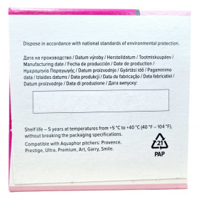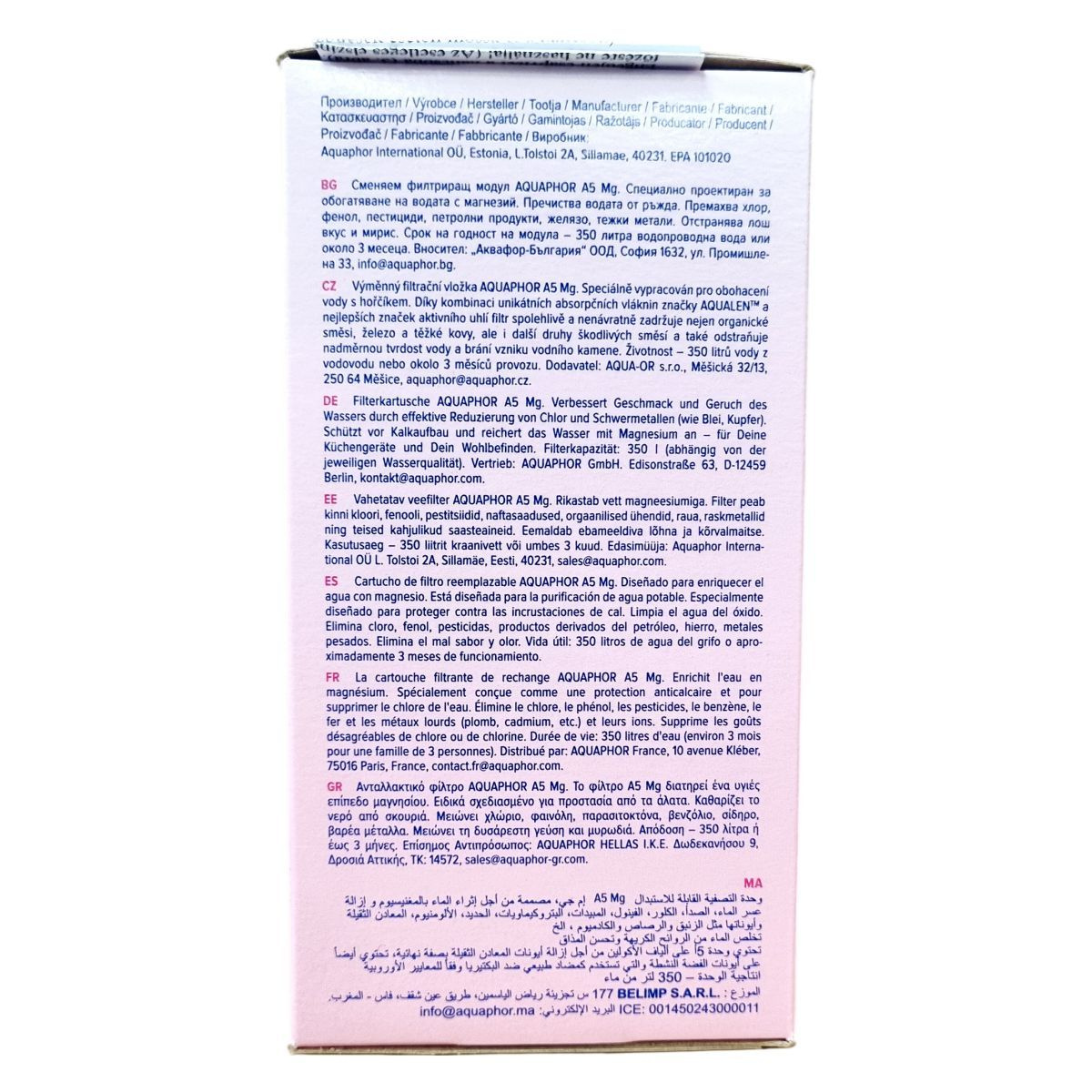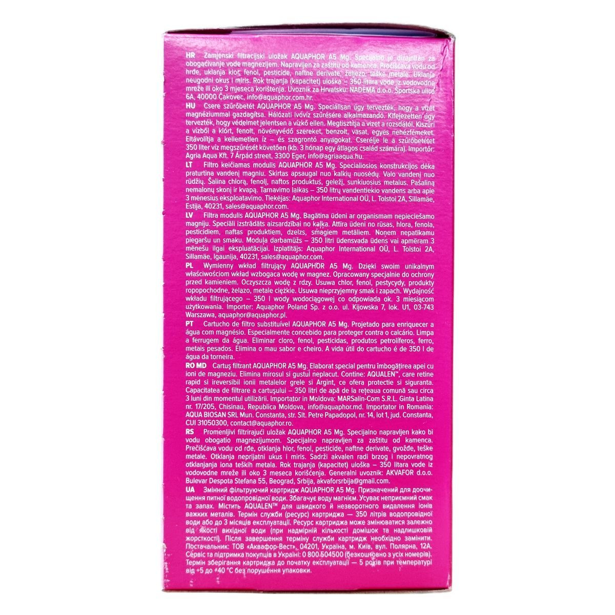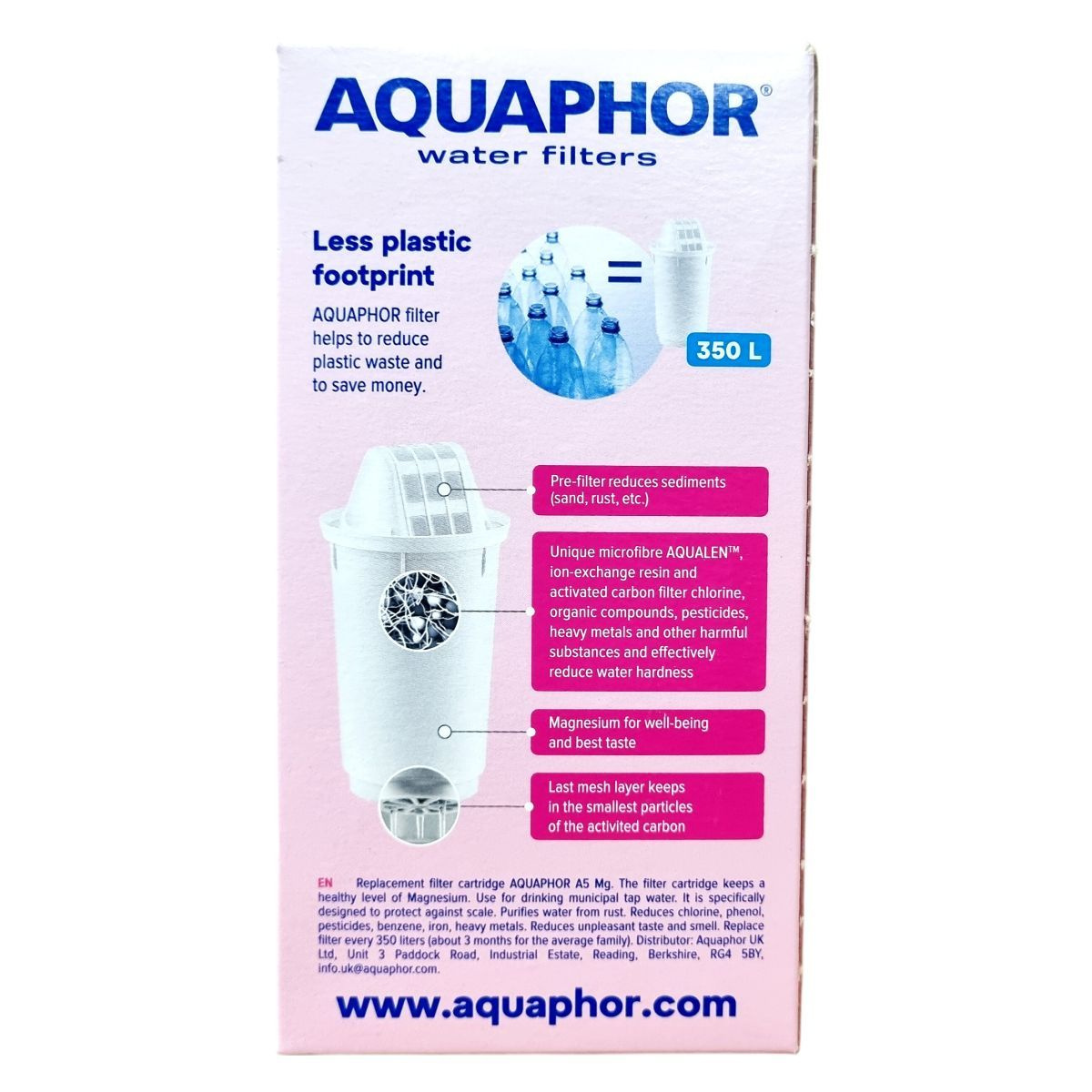 Az Aquaphor A5 Mg cserefilter kifejezetten a csapvíz tisztítására és magnéziummal való gazdagítására készült. A speciális AQUALEN™ mikroszálas szűrő, ioncserélő gyanta és aktív szén kombinációja hatékonyan eltávolítja a klórt, fenolt, peszticideket, benzolt, rozsda szemcséket, vasat, valamint a nehézfémeket, emellett csökkenti a víz keménységét és gátolja a vízkő képződését. Az ezüstion védelem biztosítja a biztonságos használatot. A filter kapacitása 350 liter, vagy körülbelül három hónap használat, mely idő után cserélni ajánlott. Az Aquaphor termékcsalád részeként kompatibilis számos kancsó modellel, segít csökkenteni a műanyaghulladékot, miközben gondoskodik az ivóvíz egészségességéről és kellemes ízéről.