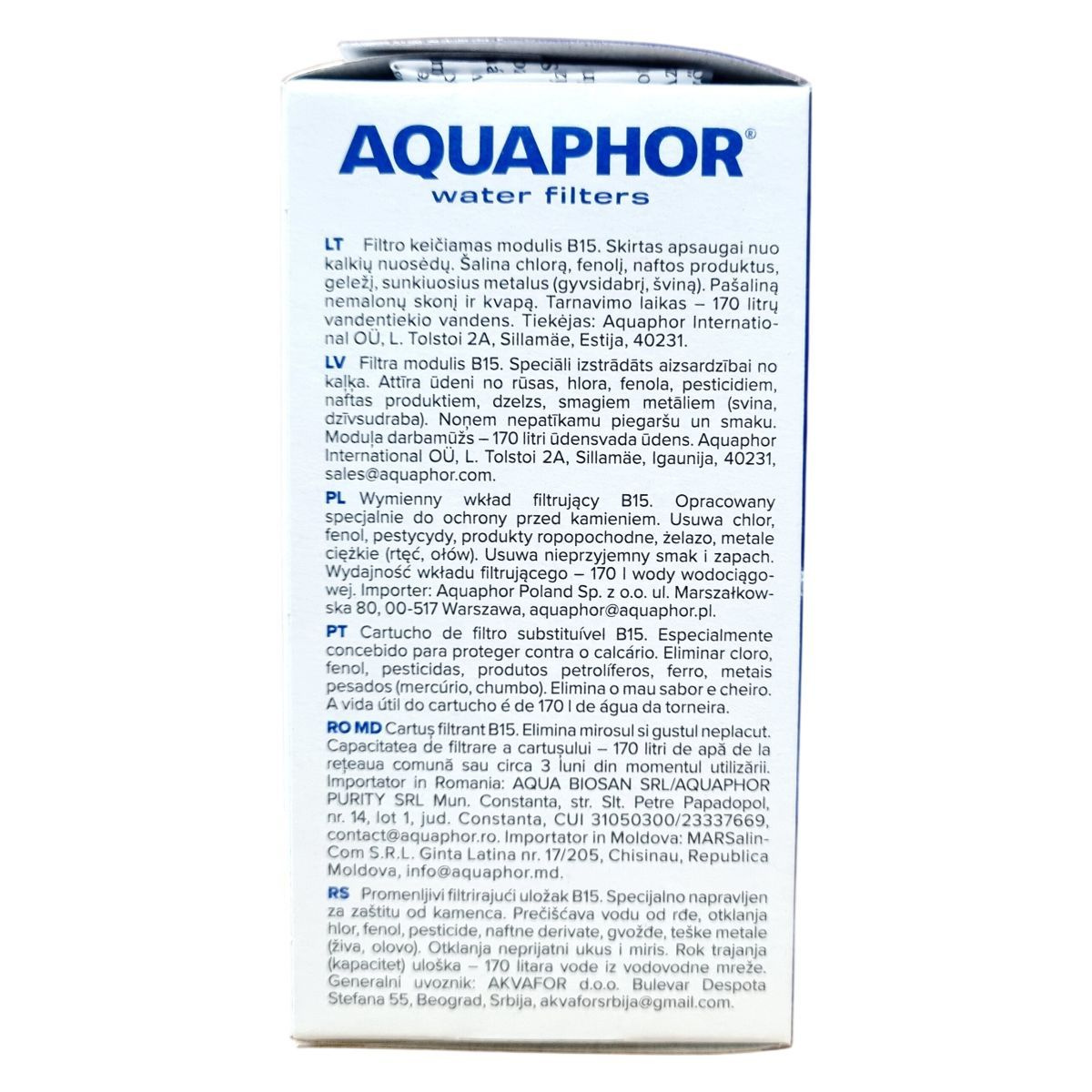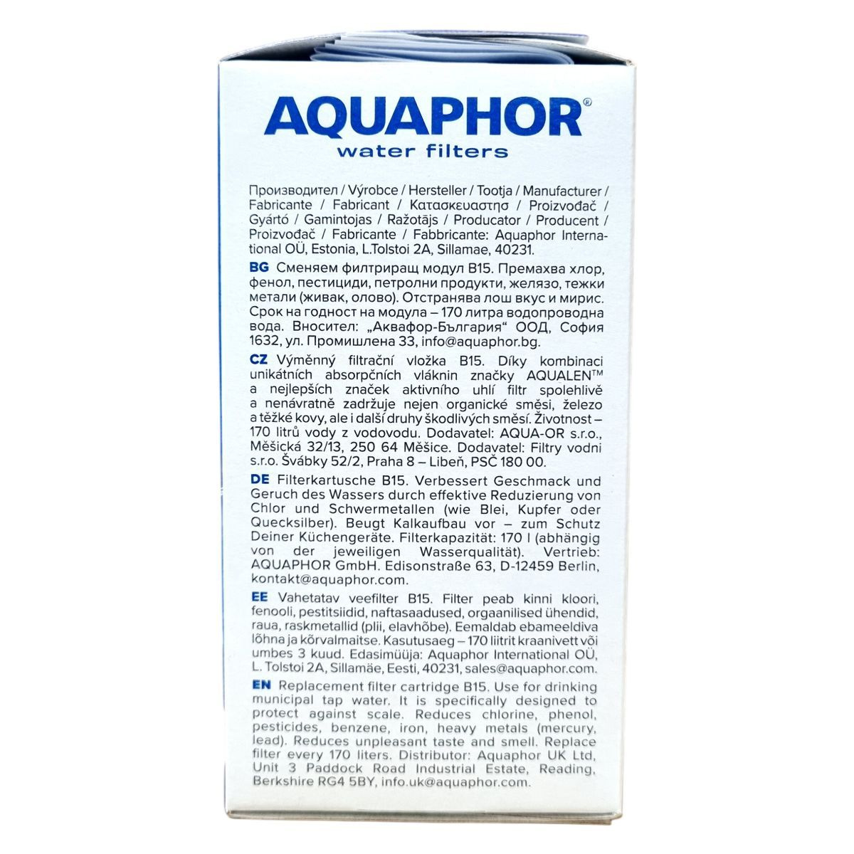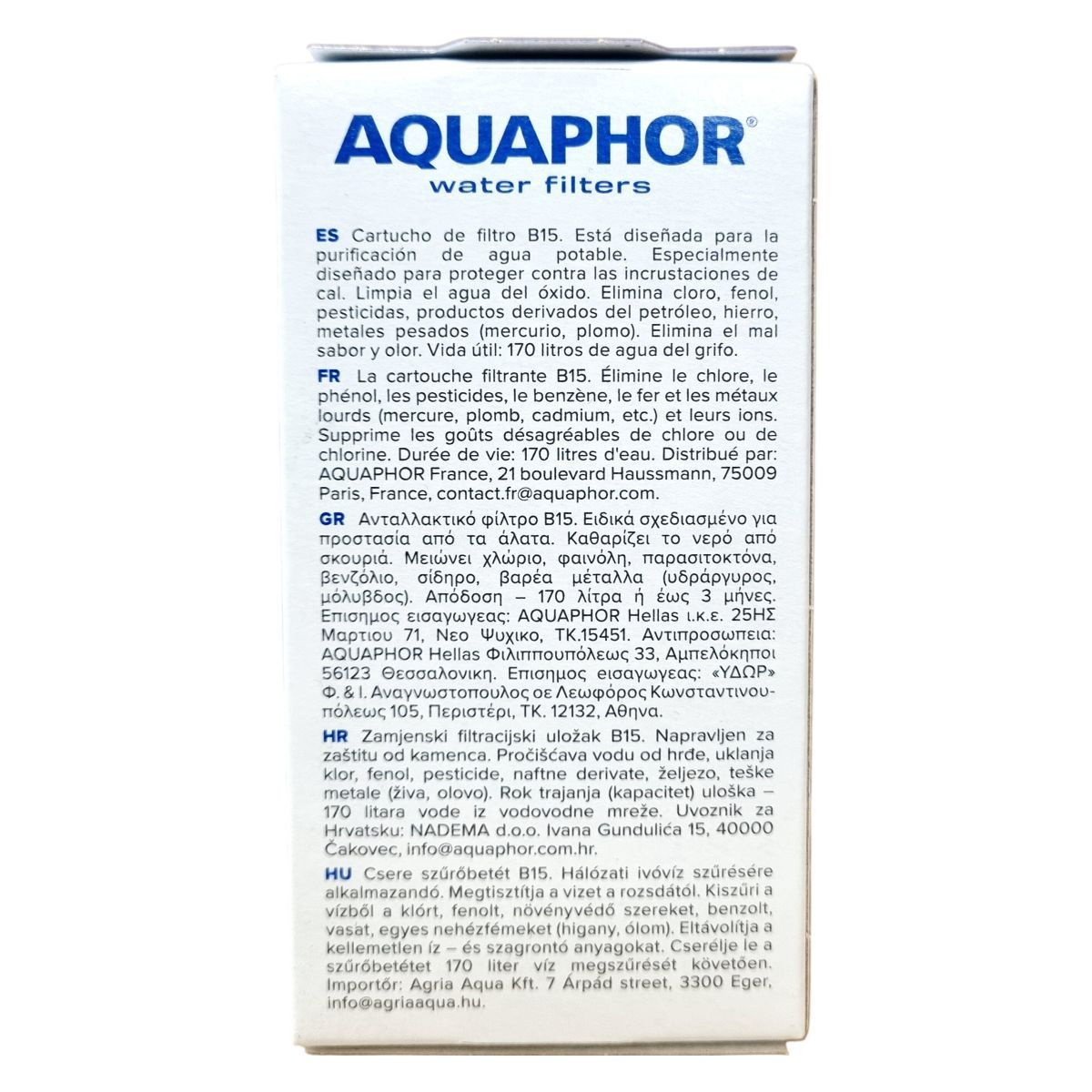 Az Aquaphor B15 csere szűrőbetét kifejezetten arra lett tervezve, hogy eltávolítsa a vezetékes ivóvízből a klórt, fenolt, növényvédő szereket, benzolt, vasat, nehézfémeket (mint a higany és ólom), valamint más szennyező anyagokat. Továbbá megszünteti a kellemetlen ízeket és szagokat, így tiszta és üde vizet biztosít. A szűrő élettartama 170 liter, ami használattól függően kb. 3 hónapig biztosít megbízható tisztítást. A benne található AQUALEN™ szálak és aktív szén kombinációja egyedülálló szűrési hatékonyságot kínál. A termék védi a háztartási készülékeket a vízkő okozta károktól, javítja az ivóvíz minőségét, és ezáltal hozzájárul egészségesebb élethez.