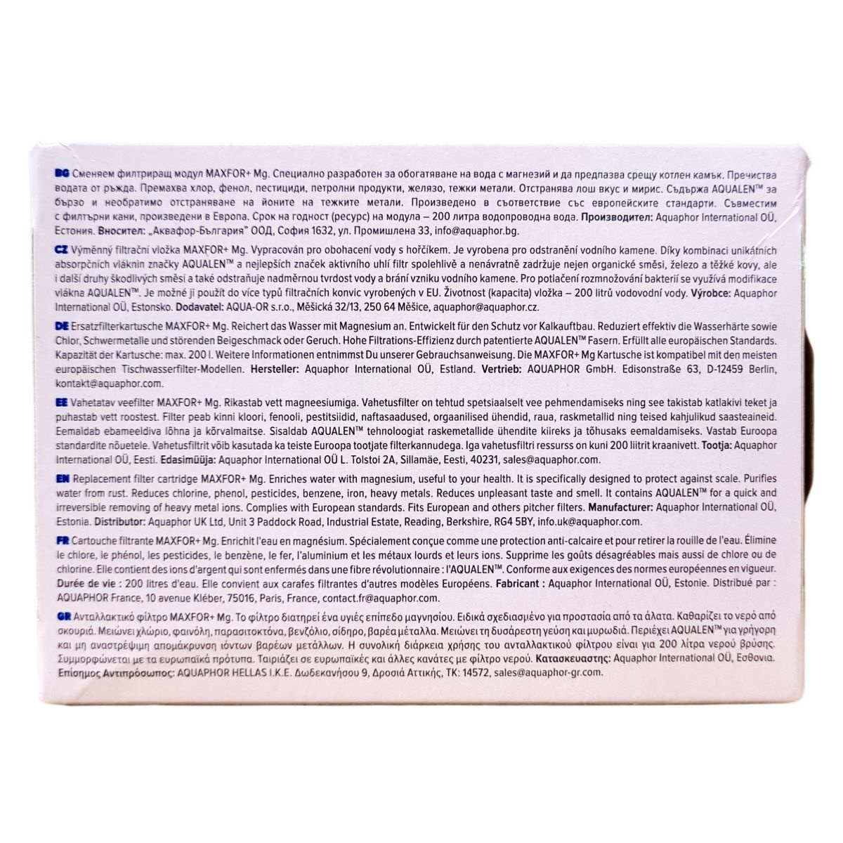 A MAXFOR+ Mg cserélhető vízszűrőbetétet az egészséges víz biztosítására fejlesztették ki úgy, hogy a vizet magnéziummal dúsítja, amely jótékony hatású a szervezet számára. Egyedi AQUALEN™ szűrőanyagán keresztül a készülék képes hatékonyan eltávolítani a vízben lévő rozsda, klór, fenol, peszticidek, benzol, vas, nehézfémek és egyéb káros anyagokat, továbbá csökkenti a vízkeménységet és megakadályozza a vízkő képződését. A szűrőbetét bármely európai gyártású kancsóval kompatibilis, így széles körben használható. Kapacitása 200 liter víz tisztítása, az AQUALEN™ anyagnak köszönhetően gyors és visszafordíthatatlan nehézfém ion eltávolítást biztosít. A betét emellett csökkenti az ízek és szagok kellemetlenségeit, így jobb minőségű és egészségesebb ivóvíz áll rendelkezésre a felhasználók számára.
